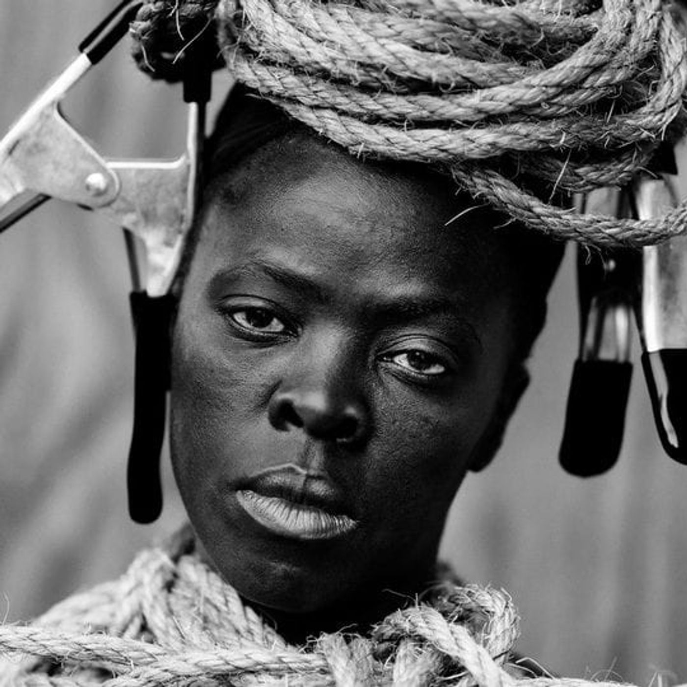 An up-close look at queer artist Zenele Muholi's self-portrait "MaID III, Philadelphia" part of her series of performative images that turns the camera on herself, using her body and face to capture the life of a black lesbian in South Africa.