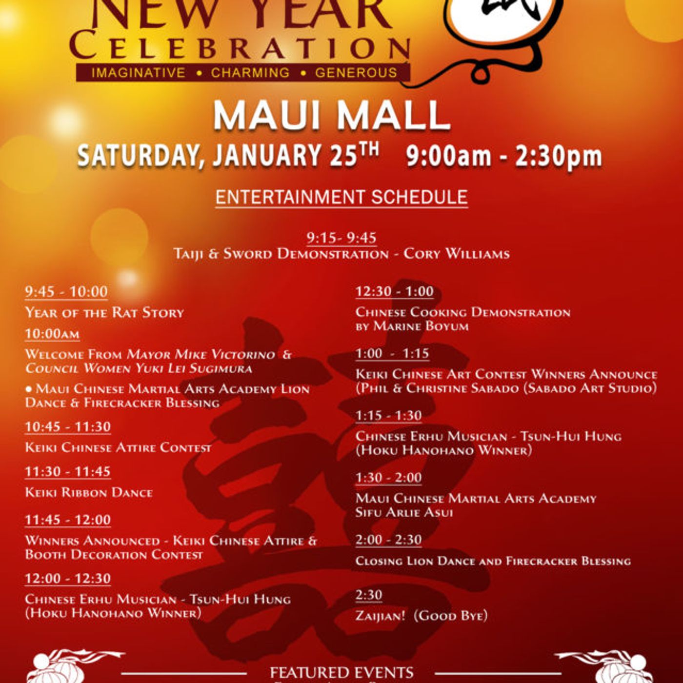 We will have live music entertainment and performances by the Maui Chinese Martial Arts Academy