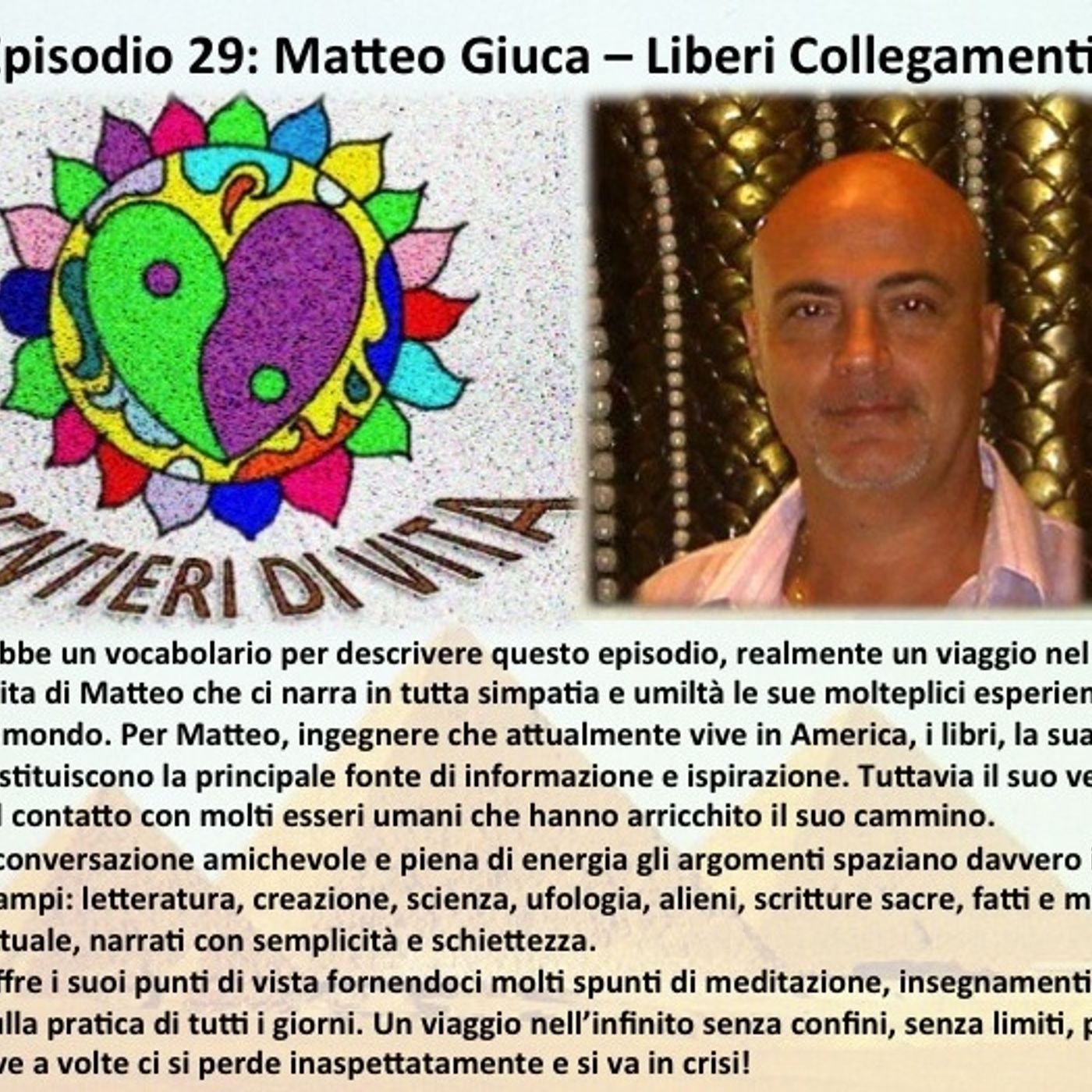 Non basterebbe un vocabolario per descrivere questo episodio, realmente un viaggio nel personale sentiero di vita di Matteo che ci narra in tutta simpatia e umiltà le sue molteplici esperienze vissute in giro per il mondo.
