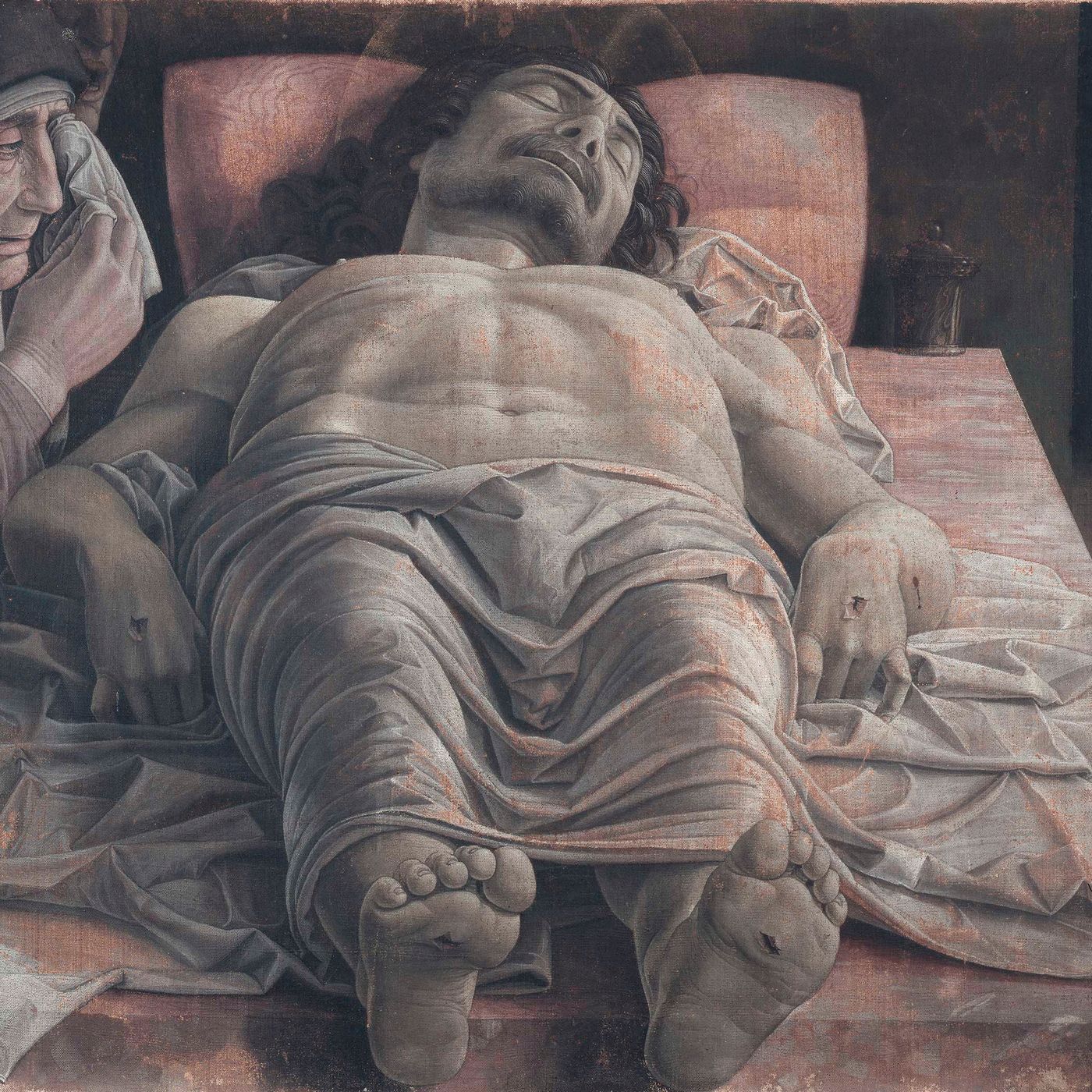 Il 2 ottobre del 1506 il figlio di Mantegna, Ludovico, offrì in vendita al marchese Gonzaga un quadro di suo padre, raffigurante un “Cristo in scurto”, rimasto tra i beni di famiglia dopo la morte dell’artista. Qui Gesù figura già stato deposto dalla croce e il suo corpo è adagiato sulla «pietra dell’unzione». Ma nella morte di Cristo si rispecchia quella di ogni uomo e nel silenzio si riesce a sentire la presenza di Dio, che la riscatta.