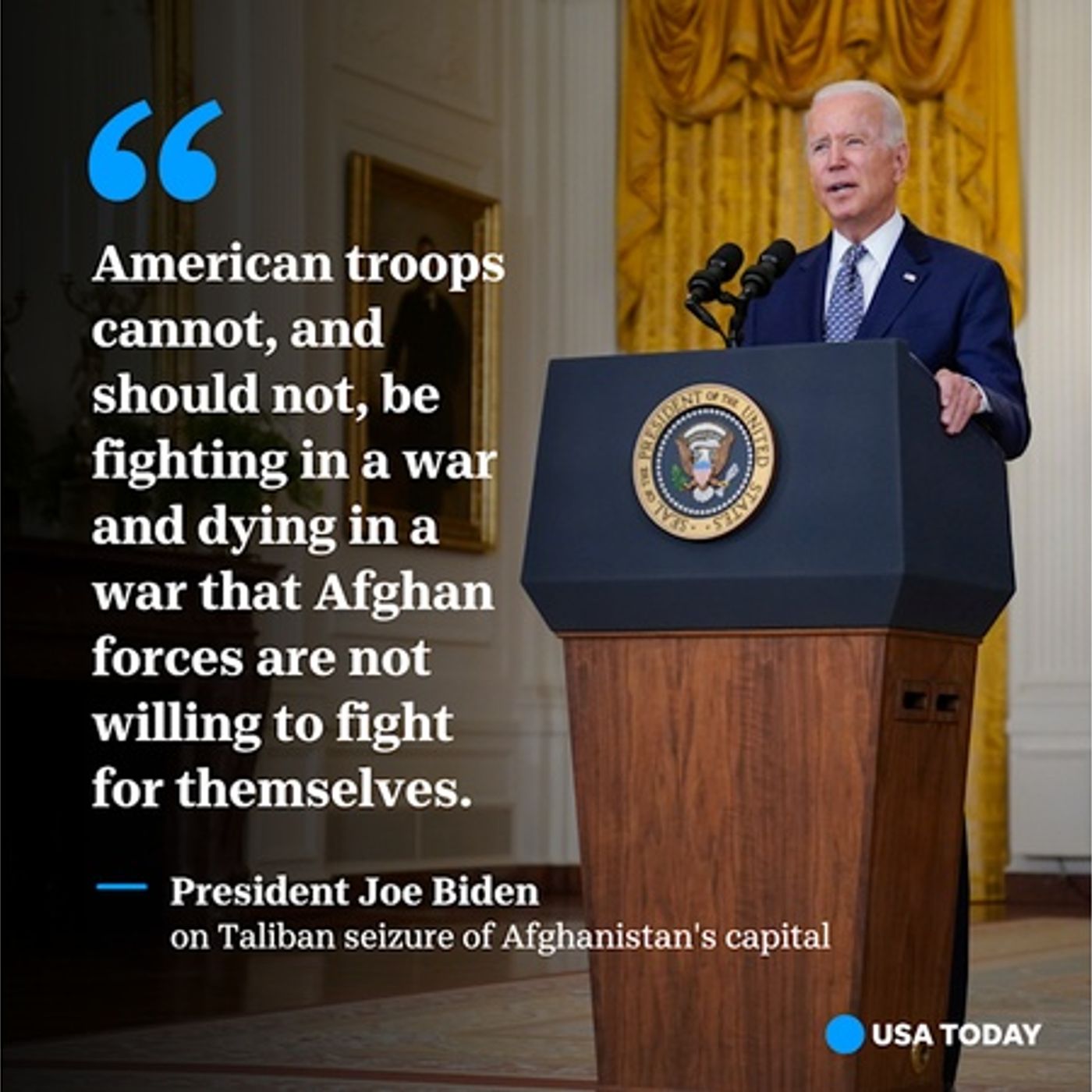 "Afghanistan political leaders gave up and fled the country; the Afghan military collapsed, sometimes without trying to fight," Biden said. "If anything, the developments of the past week reinforce that ending U.S. military involvement in Afghanistan now was the right decision."