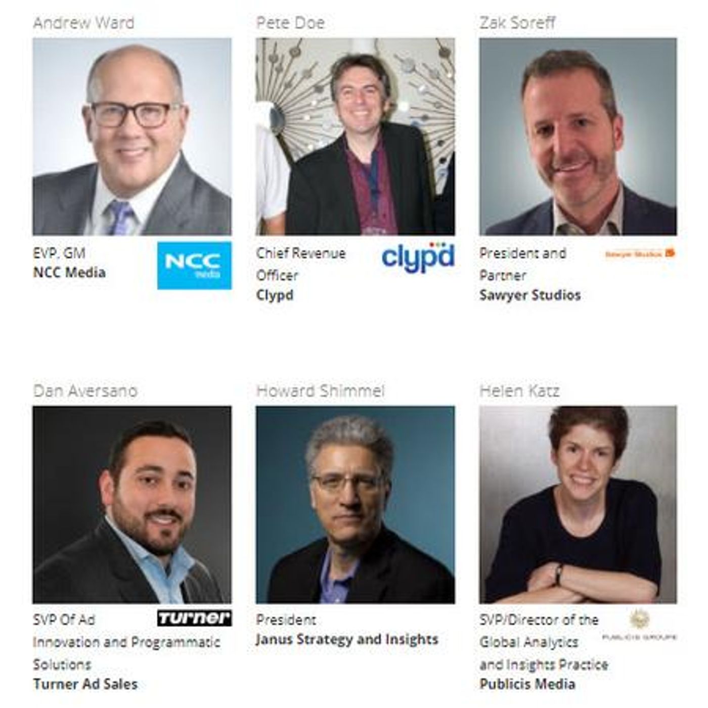Dan Aversano, SVP of Ad Innovation and Programmatic Solutions, Turner IgnitePete Doe, Chief Research Officer, ClypdHelen Katz, SVP/Global Director of Data and Contracts, Publicis SpineHoward Shimmel, President, Janus Strategy and Insights (Moderator)Zachary Soreff, President, Sawyer StudiosAndrew Ward, EVP/GM, NCC Media