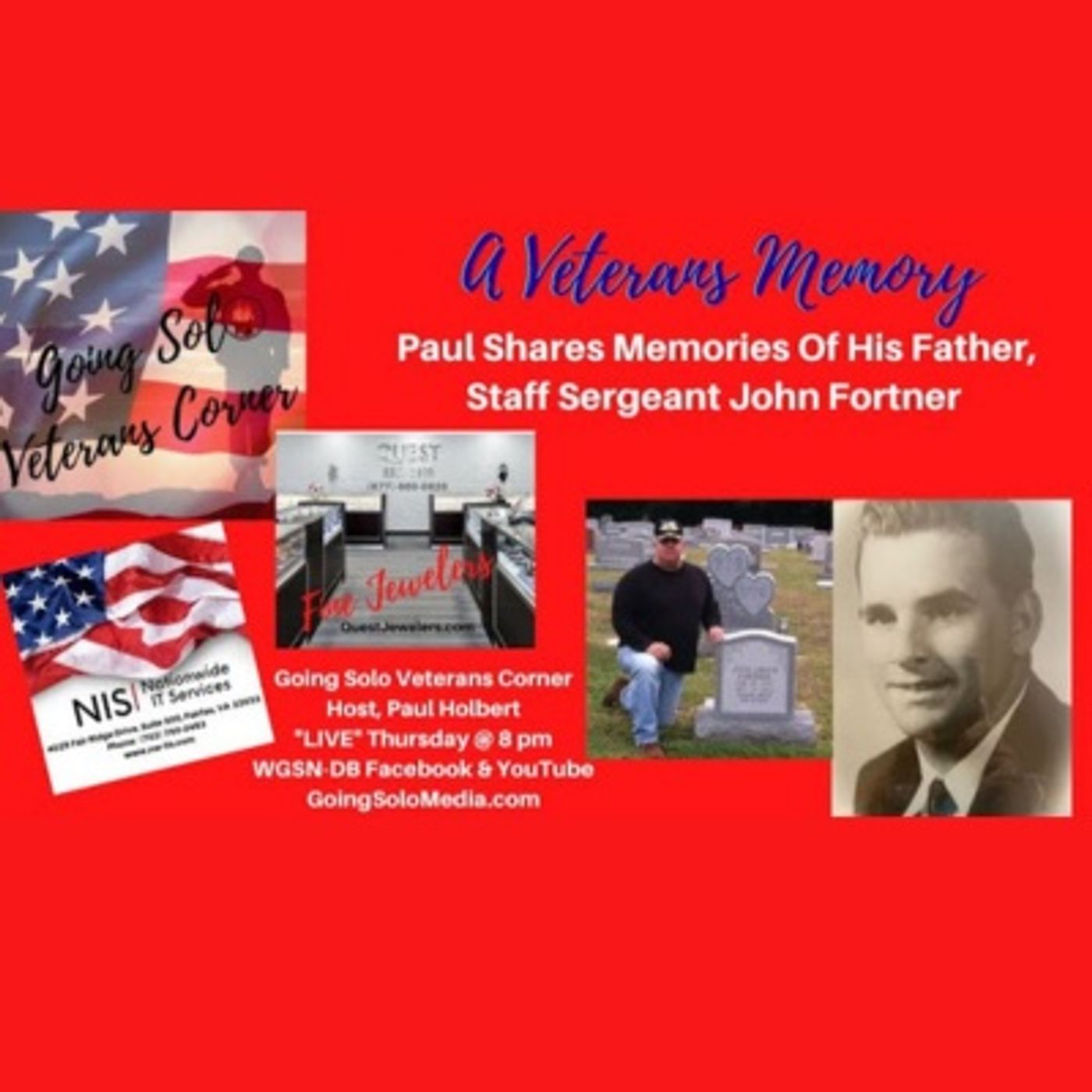 A Veterans Memory - Our host, Paul Holbert shares the story of his own Father, Staff Sergeant John Fortner, who he lost at the age of five and how it impacted his life. On the Going Solo Veterans Corner Show. WGSN-DB Going Solo Network 24/7 Live Streaming Radio, TV & Podcasts - #1 Internet Singles Talk Network (www.goingsolomedia.com) for a Complete Singles Connection (www.goingsolonetwork.com) Show sponsored by Quest Fine Jewelers - (877) -860-0826 - QuestJewelers.com and National IT Services (NIS), 4025 Fair Ridge Drive, Suite #00, Fairfax, VA 22033 (703) 750-0453. www.nw-its.com A bit about Paul... Paul Holbert, is a twenty-one-year retired army veteran and author who conveys his experiences and imagination in works of adventure and fiction. Despite health struggles following his military service, Paul feels fortunate and uses writing as a form of therapy to deal with PTSD. He also wanted to find a way to give back to other veterans who struggle with everyday life which led him to doing the show on the Going Solo Network. He and his wife make their home in northern Virginia, where he currently works for a federal agency and serves as an adjunct professor, teaching for a local college. You can find Paul’s books on his web site, TheLiteraryVet.net, and on Barnes & Noble and Amazon. Veterans Info: Learn more about the Veterans Canteen Service - an online store and merchandise center for veterans and their families. https://www.vacanteen.va.gov/VACANTEE...