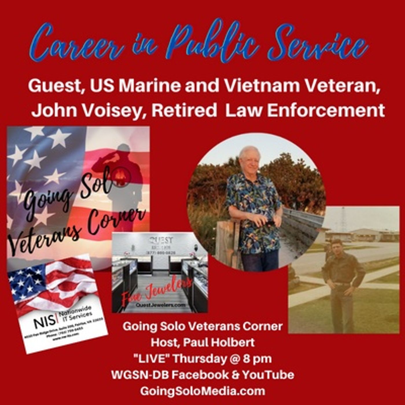Come and meet US Marine and Vietnam Veteran John Voisey who continued his life of public service in a career in Law Enforcement and Host, Paul Holbert, Retired 21 year Army Veteran & Author, The Literary Vet on the Going Solo Veterans Corner Show.