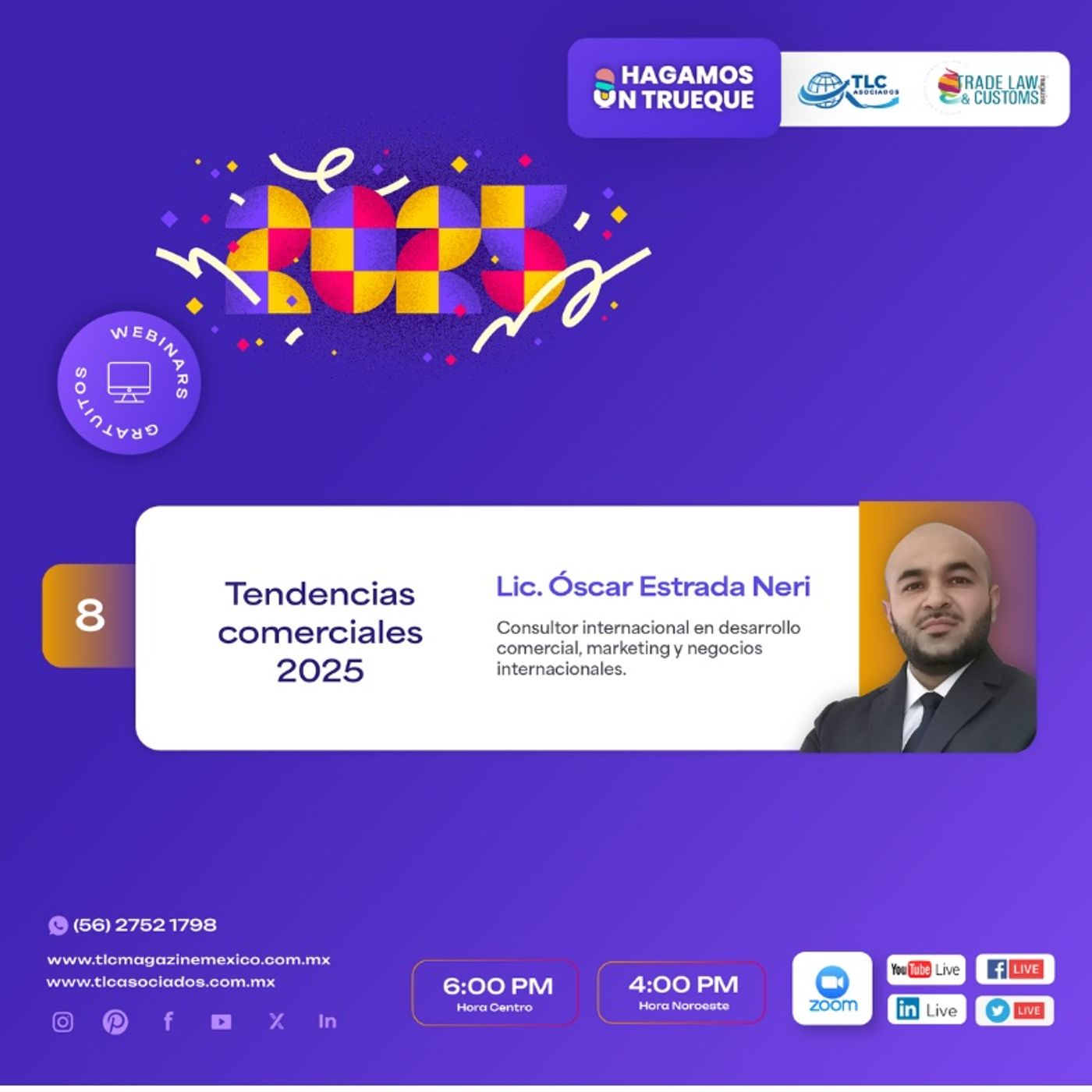 🎯 ¿Estás preparado para conocer las "Tendencias comerciales 2025"? 📊🌍 El Lic. Óscar Estrada Neri, Consultor internacional en desarrollo comercial, marketing y negocios internacionales, te guiará a través de las principales tendencias que estarán influyendo en el mercado global.