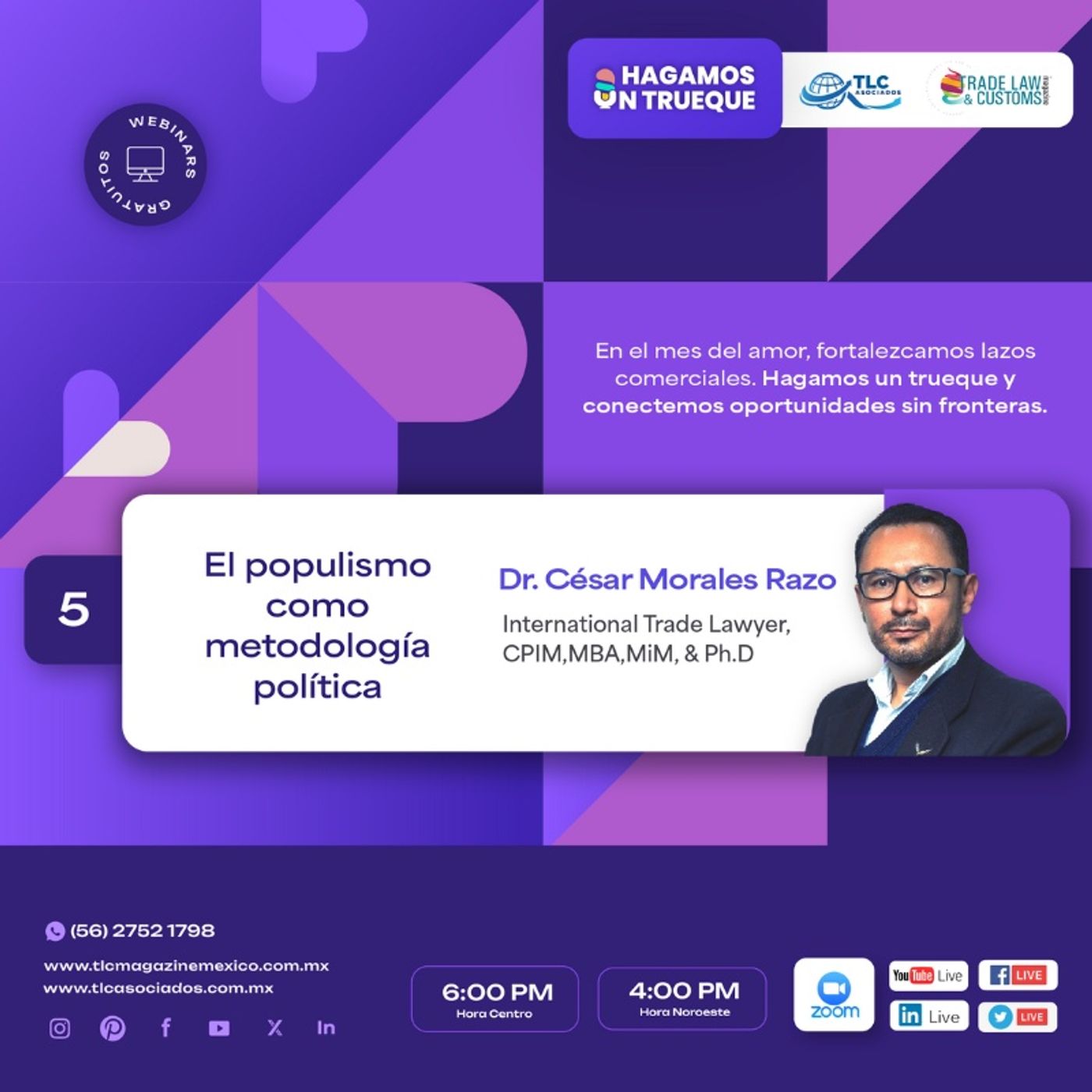 🎯 El populismo no es solo un discurso político, sino una estrategia que ha transformado economías y relaciones internacionales. ¿Cómo influye en el comercio global y en la toma de decisiones económicas? 💡 El Dr. César Morales Razo,International Trade Lawyer, CPIM,MBA,MiM, & Ph.D Candidate nos guiará en esta sesión sobre el "Populismo como metodología política", explorando sus impactos y aplicaciones actuales.