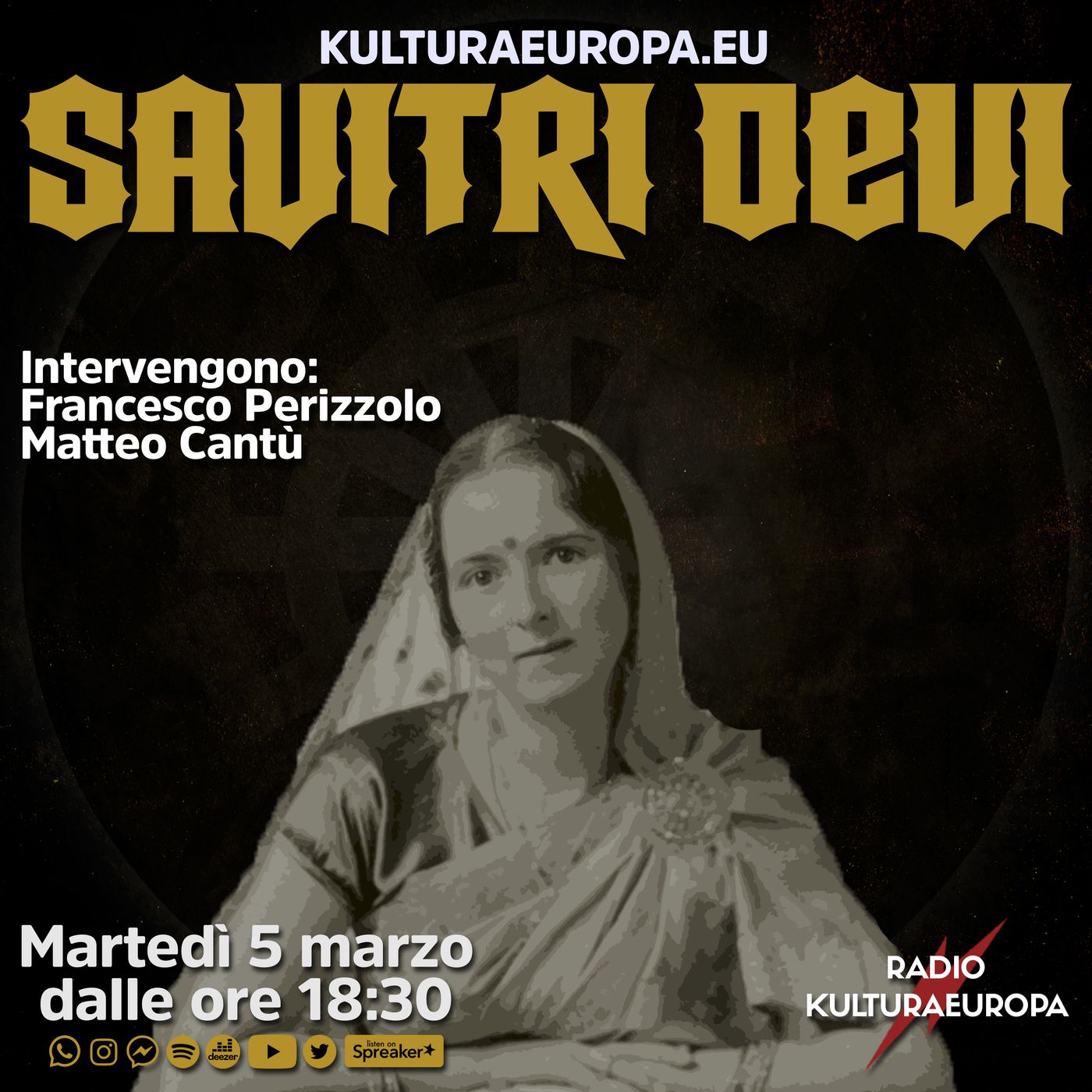 In questa diretta del martedì, Alessandro Autiero e Matteo Cantù conversano con Francesco Perizzolo sulla controversa figura di Savitri Devi, al secolo Maximiani Julia Portas.