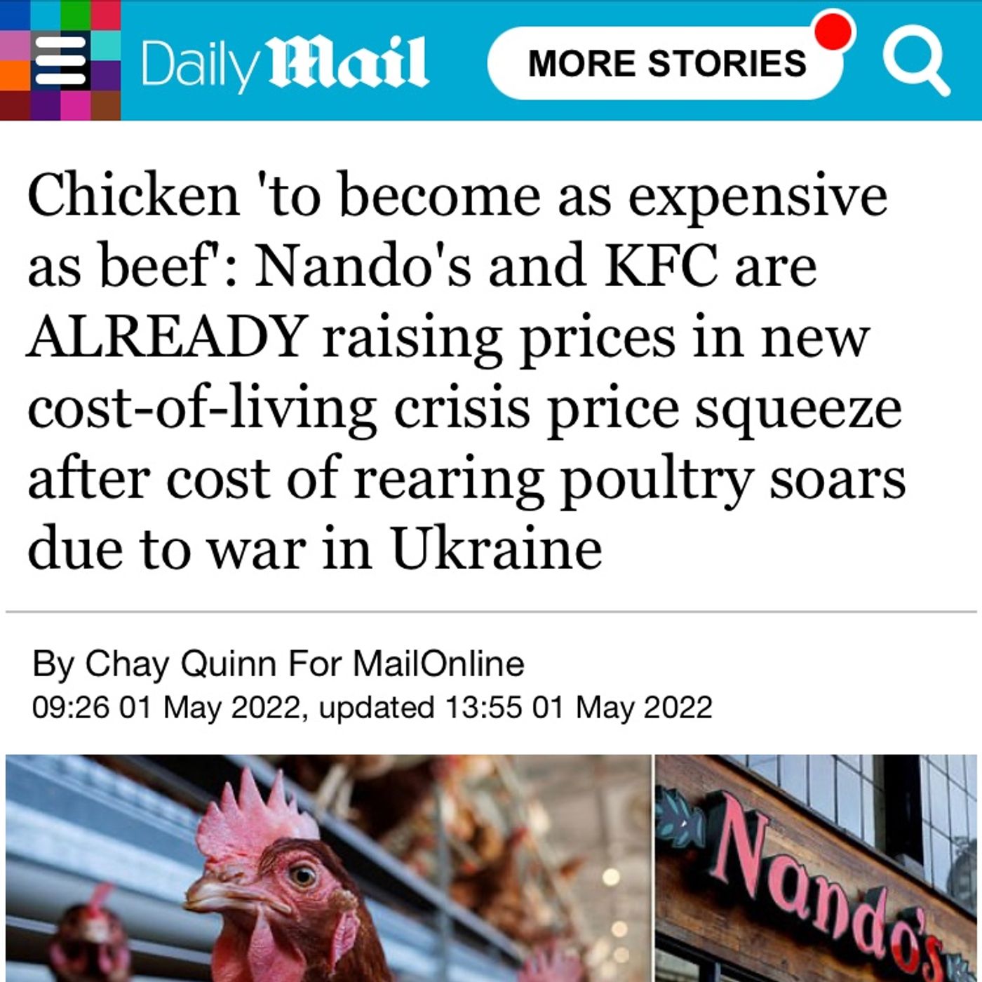 Chicken 'to become as expensive as beef': Nando's and KFC are ALREADY raising prices in new cost-of-living crisis price squeeze after cost of rearing poultry soars due to war in Ukraine