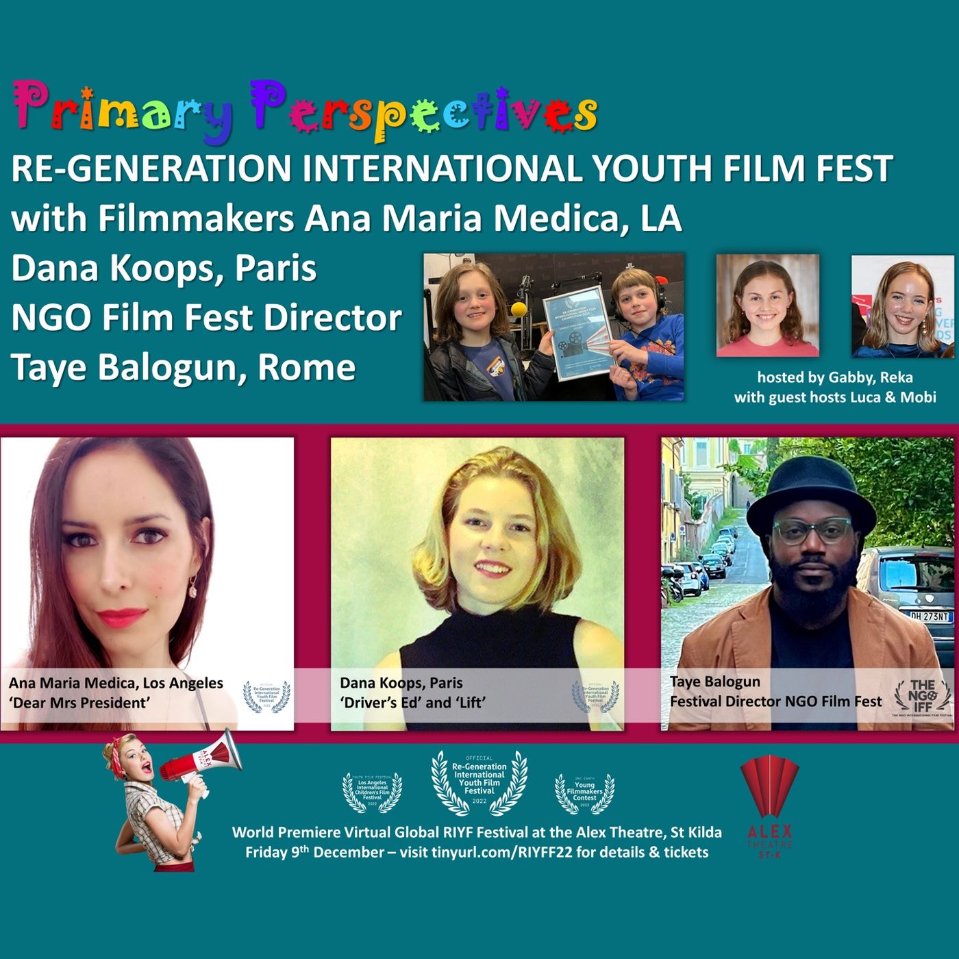 In this FINAL episode in the series of #RIYFF22 Specials for 2022 Gabby and Reka welcome guest hosts, young filmmakers Luca and Mobi from Spensley Street Primary School, winners of the RIYFF 22 Student Film Award for Best Live Action, sponsored by Adobe. The team cross to USA to chat with Ana Maria Medici in USA about her animated film Dear Mrs. President, Dana Koops in Paris about her films ‘Driver’s Ed’ and ‘Lift’, and Taye Balogun festival director for The NGO International Film Festival about Tangled Up in You and Rio by Unique Sights - all films featured in this global online RE-Generation Youth Film Fest.