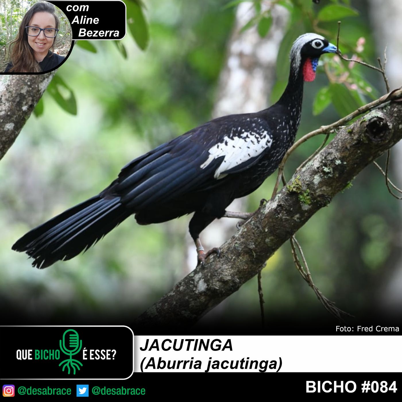 Olá! Bem-vindos mais um “Que bicho é esse?”, eu sou a Miriam Perilli e o episódio de hoje é sobre a belíssimo jacutinga (Aburria jacutinga). E para falar sobre essa magnífica ave eu conversei com a Alines Sales Bezerra! Aline é graduada em gestão ambiental e engenharia ambiental com experiência voltada para o mercado profissional na indústria e consultoria. Na área de conservação ambiental, atua no Programa de Conservação de Aves Cinegéticas da Mata Atlântica: Reintrodução e Monitoramento de Jacutingas, desenvolvido pela ONG Save Brasil na APA São Francisco Xavier, participando da reabilitação de jacutingas (Aburria jacutinga) com treinamentos alimentares e anti predadores, bem como o monitoramento dos indivíduos reintroduzidos através de radiotelemetria para o levantamento de dados. Como mestranda do Programa de Conservação da Fauna da Universidade Federal de São Carlos, desenvolve a pesquisa relacionada aos requisitos ecológicos e a seleção de áreas para reintrodução de jacutinga no distrito de São Francisco Xavier, que trará contribuições acerca da ecologia desta espécie e ferramentas para tomadas de decisão sobre o planejamento das reintroduções e o uso do território considerando as exigências destas aves. Vocalização SILVA, R. S. (2011). [WA297005, Aburria jacutinga (Spix, 1825)]. Wiki Aves - A Enciclopédia das Aves do Brasil. Disponível em: Acesso em: 03 Set 2022. Site do Projeto Jacutinga http://savebrasil.org.br/projeto-jacutinga Texto do Prof. Mauro Galetti https://oeco.org.br/analises/a-jacutinga-e-as-mudancas-climaticas/ Entrevista com Gustavo Fonseca https://open.spotify.com/episode/5zoOw8Ydu2nLmCzC79y4Zm?si=a401abc1c9094abb Dá uma força para manter o DesAbraçando online e com episódios no cronograma contribuindo financeiramente com nosso projeto: O DesAbraçando é um projeto independente e conta com o apoio dos ouvintes para se manter online e pagar a edição de áudio. Se você curte o projeto, considere apoiar financeiramente. Você pode contribuir a partir de R$ 1,00 no www.apoia.se/desabrace Segue a gente lá nas redes sociais: Instagram https://www.instagram.com/desabrace/Instagram Facebook https://web.facebook.com/desabrace/Facebook Twitter https://twitter.com/desabrace Canal no Telegram https://t.me/desabrace Visite nossa página: https://www.desabrace.com.br Envie suas pedradas: primeirapedra@desabrace.com.br Envie sua resposta para o "Que bicho é esse?": bicho@desabrace.com.br Apresentação e pauta: Miriam Perilli Produção: Fernando Lima Edição de Áudio: Senhor A