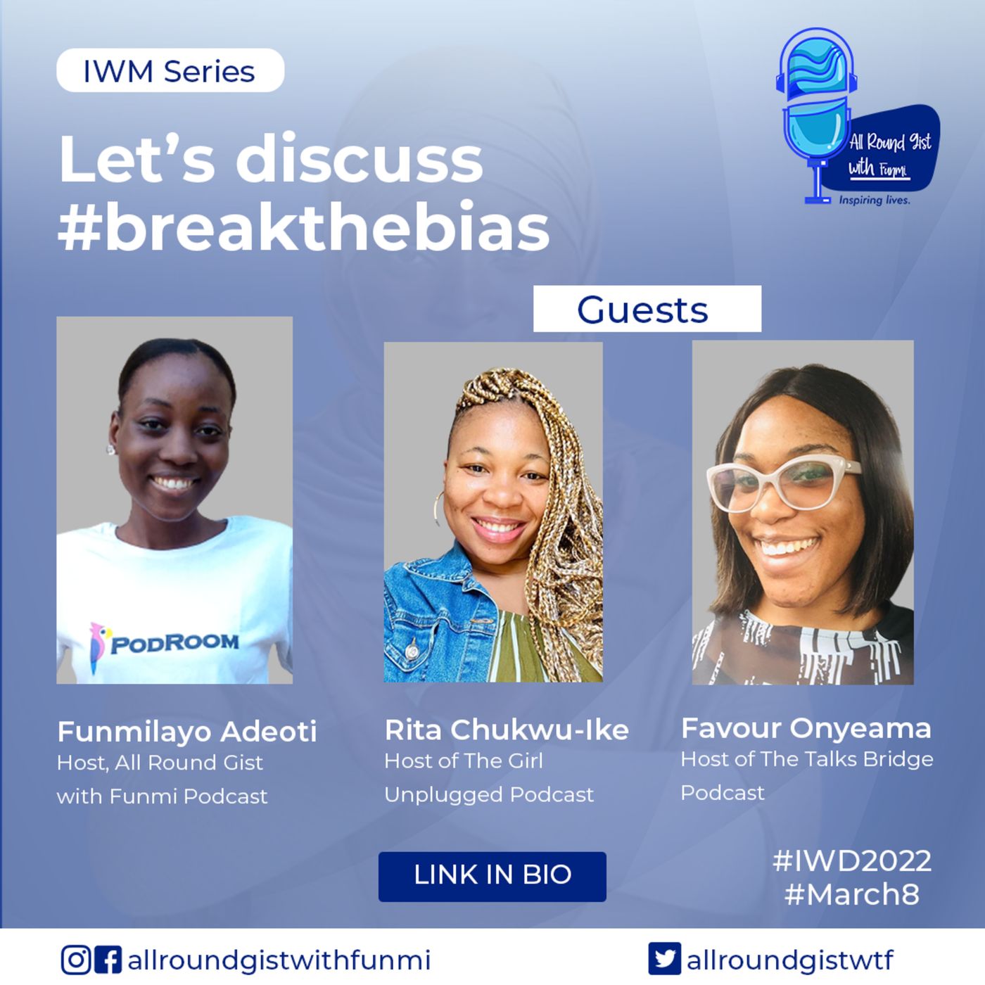 Let's discuss #breakthebias. This episode talks about the bias women face, what we need to do and all that. I had amazing guests who joined me on this conversation. It's a wonderful one! Trust me, you would enjoy it! They shared their experience and we had lots of fun!! So, click on the play button to listen right away. And you can join me and the gisters community on Podroom to have a chat concerning this episode. Enjoy🍹. --- Send in a voice message: https://anchor.fm/funmilayo-adeoti/message