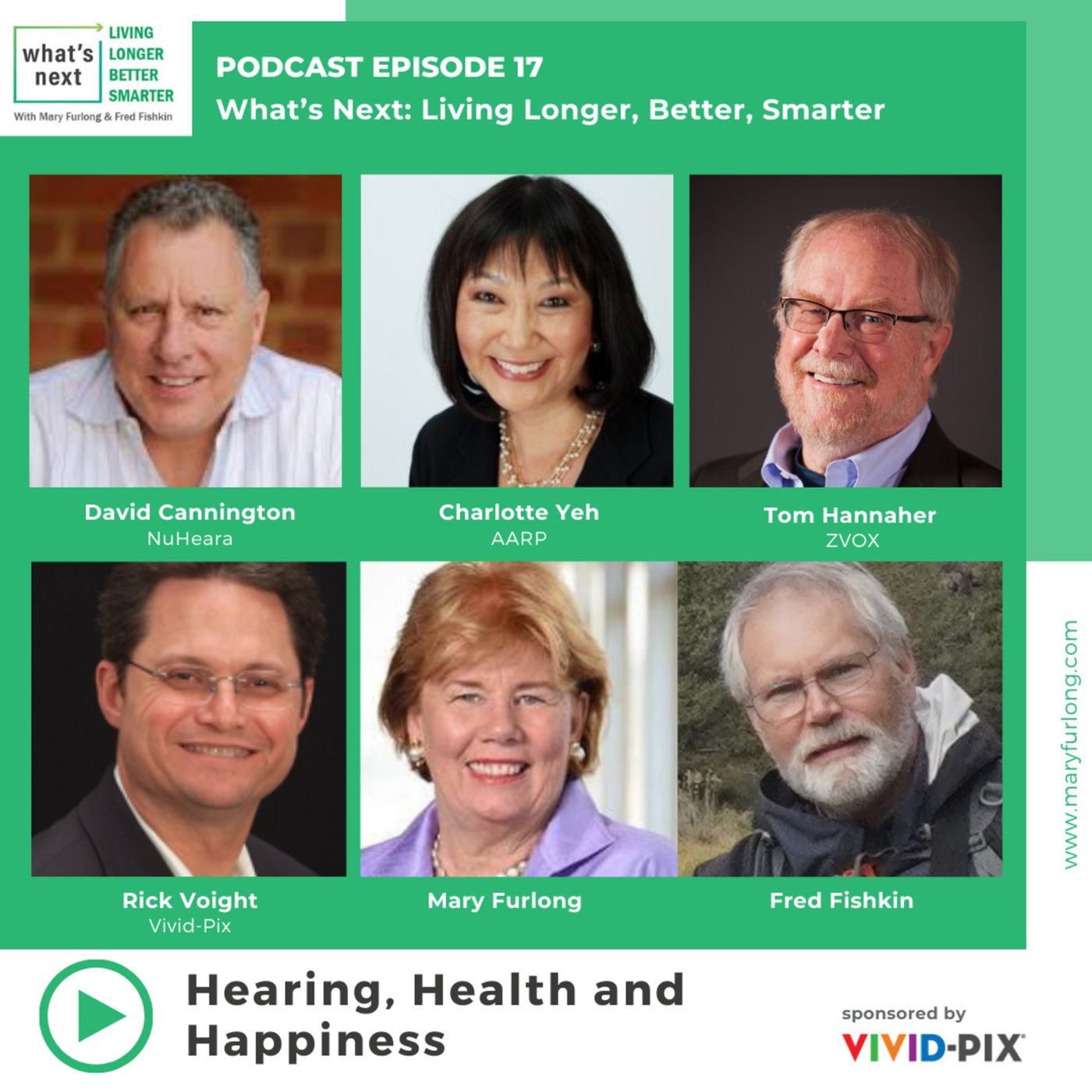 What does hearing have to do with your health and happiness? In a word, everything. And there are new innovations and policies that can make getting help easier and smarter. The AARP's Dr. Charlotte Yeh joins Mary Furlong and Fred Fishkin along with NuHeara's David Cannington, Tom Hannaher from ZVox Audio and Rick Voight from Vivid-Pix for episode 17 of What's Next... Living Longer, Better, Smarter: Hearing, Health and Happiness.