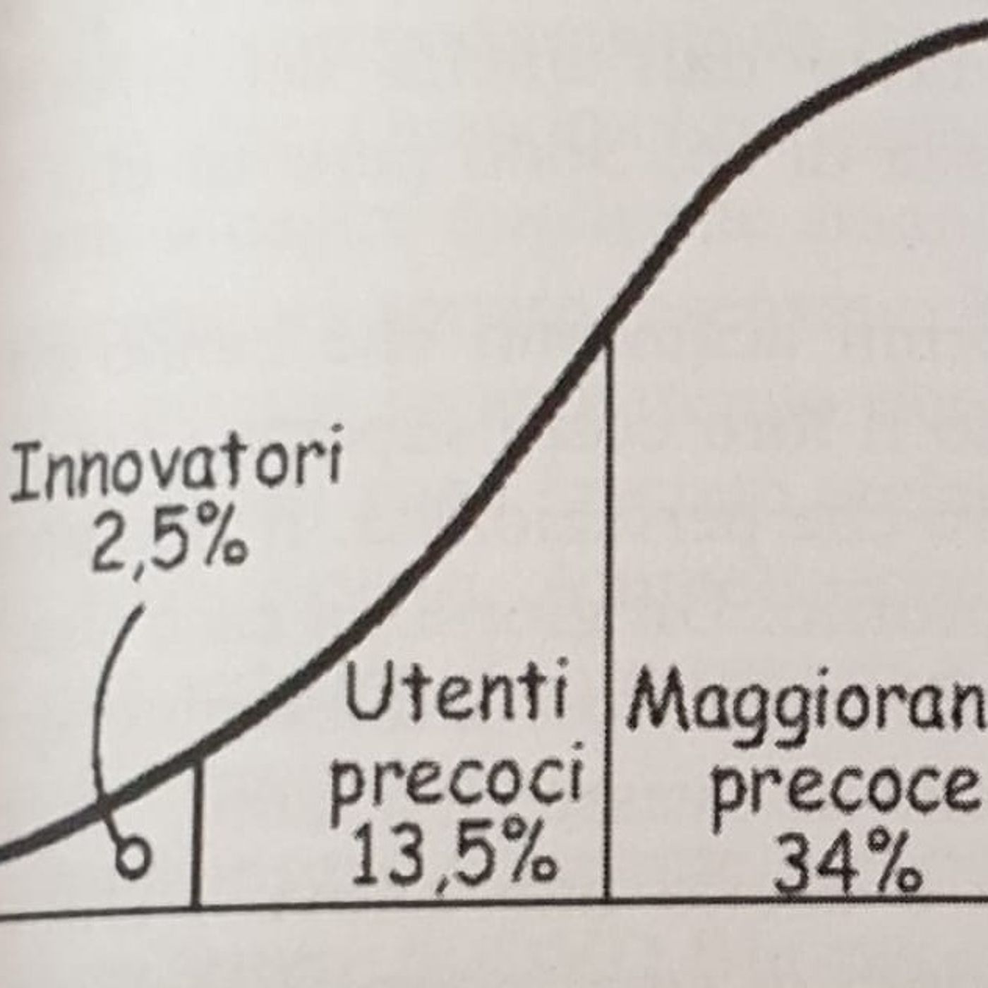 La legge della diffusione dell'innovazione meglio nota come curva di Moore identifica gli innovatori, gli adattatori precoci, la maggioranza precoce, la maggioranza tardiva, i ritardatari. Scopri in quale parte della curva ti trovi e anche dove si posizionano i tuoi clienti.