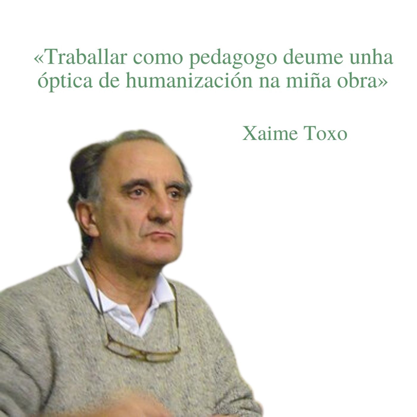 Xaime Toxo é un escritor galego, mestre e pedagogo. É especialista en atención escolar á rapazada con discapacidade visual e fundador da Asociación Bidueiro de Bueu, ademais de presidente do Ateneo de Pontevedra. É tamén autor en narrativa e poesía e vén de publicar en 2023 a novela 70 graos norte.