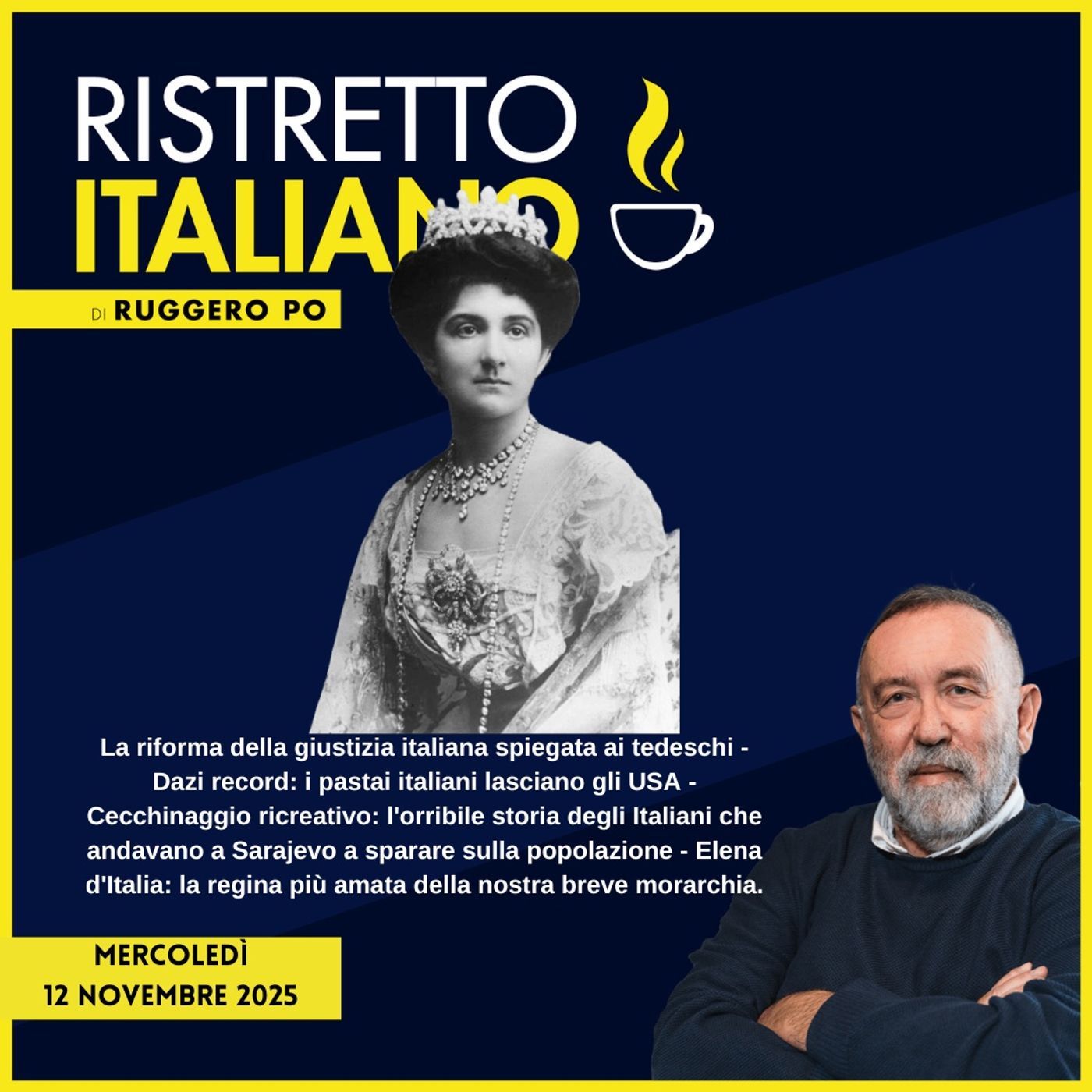 La riforma della giustizia italiana spiegata ai tedeschi - Dazi record: i pastai italiani lasciano gli USA - Cecchinaggio ricreativo: l'orribile storia degli Italiani che andavano a Sarajevo a sparare sulla popolazione - Elena d'Italia: la regina più amata della nostra breve morarchia.