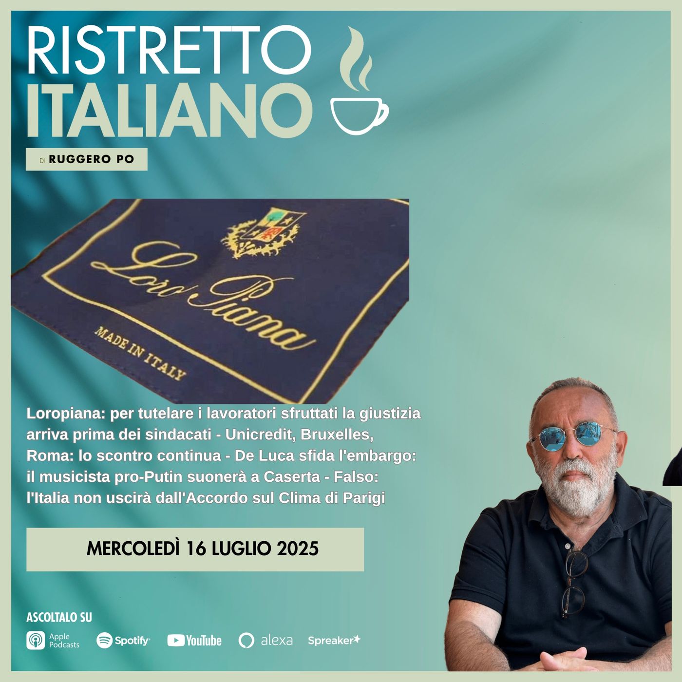 Loropiana: per tutelare i lavoratori sfruttati la giustizia arriva prima dei sindacati - Unicredit, Bruxelles, Roma: lo scontro continua - De Luca sfida l'embargo: il musicista pro-Putin suonerà a Caserta - Falso: l'Italia non uscirà dall'Accordo sul Clima di Parigi