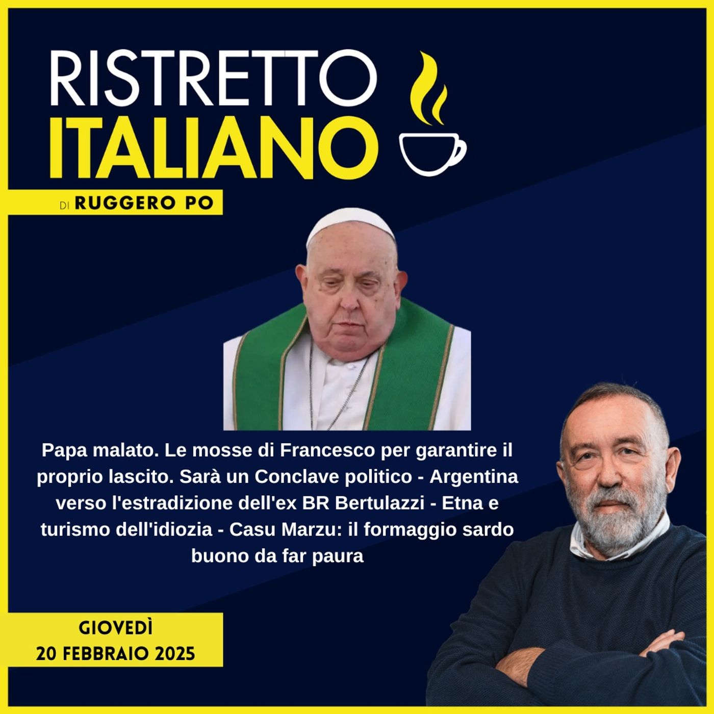 Papa malato. Le mosse di Francesco per garantire il proprio lascito. SarĂ un Conclave politico - Argentina verso l'estradizione dell'ex BR Bertulazzi - Etna e turismo dell'idiozia - Casu Marzu: il formaggio sardo buono da far paura