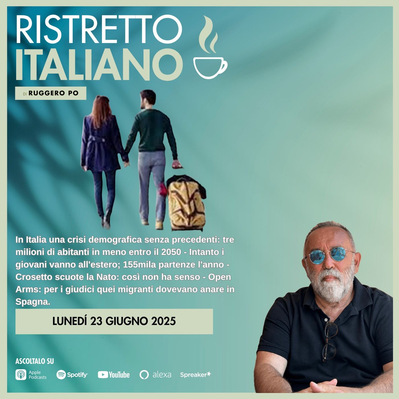 In Italia una crisi demografica senza precedenti: tre milioni di abitanti in meno entro il 2050 - Intanto i giovani vanno all'estero; 155mila partenze l'anno - Crosetto scuote la Nato: così non ha senso - Open Arms: per i giudici quei migranti dovevano anare in Spagna.
