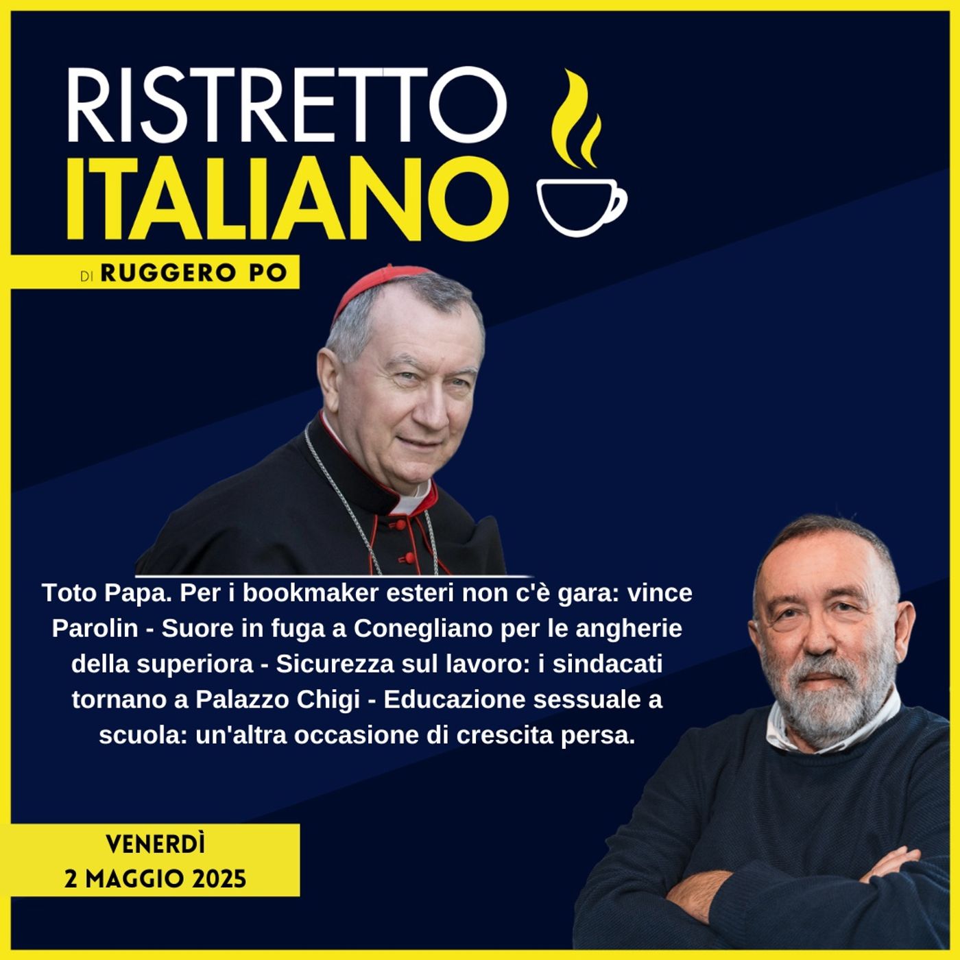 Toto Papa. Per i bookmaker esteri non c'รจ gara: vince Parolin - Suore in fuga a Conegliano per le angherie della superiora - Sicurezza sul lavoro: i sindacati tornano a Palazzo Chigi - Educazione sessuale a scuola: un'altra occasione di crescita persa.