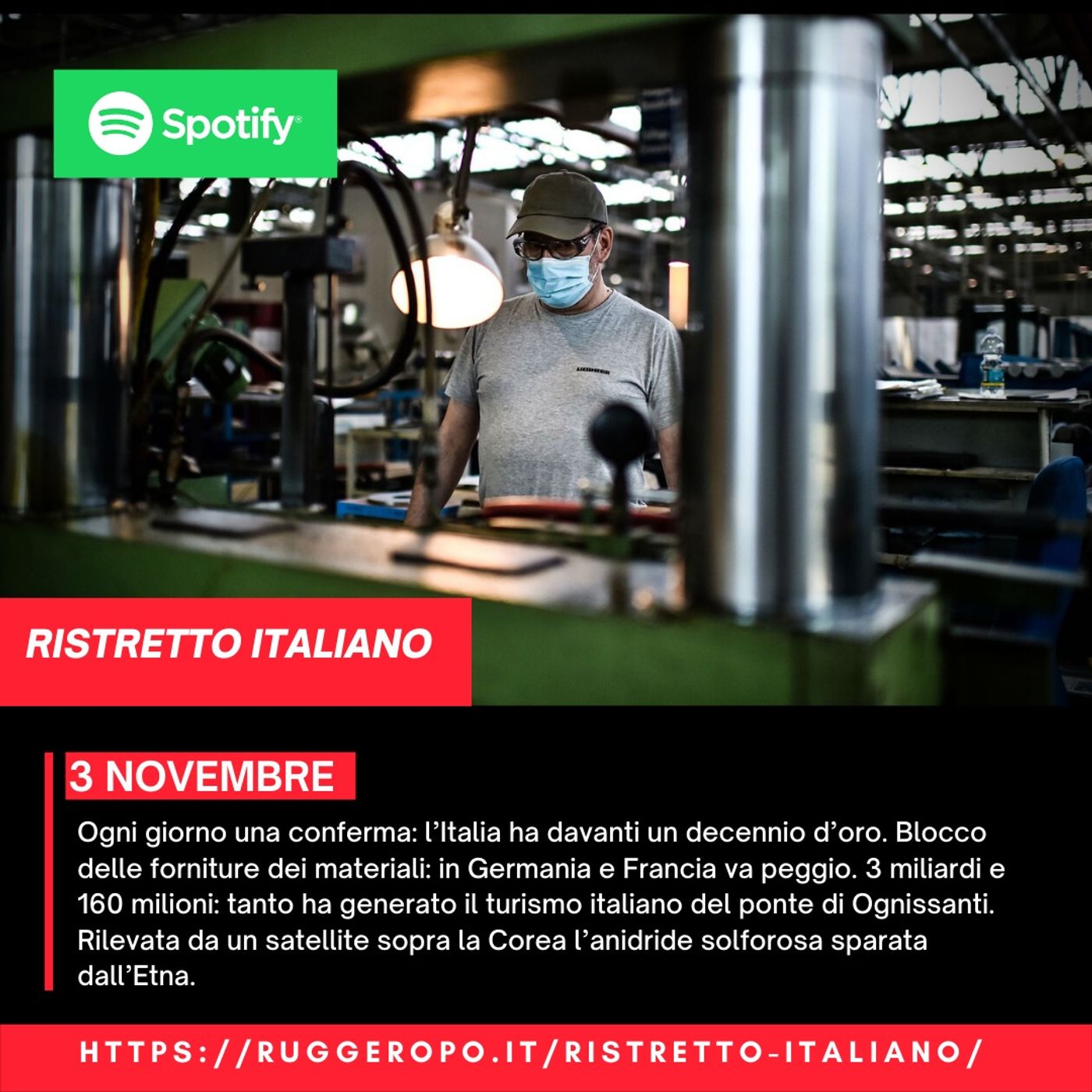 Ogni giorno una conferma: l’Italia ha davanti un decennio d’oro. Blocco delle forniture dei materiali: in Germania e Francia va peggio. 3 miliardi e 160 milioni: tanto ha generato il turismo italiano del ponte di Ognissanti. Rilevata da un satellite sopra la Corea l’anidride solforosa sparata dall’Etna.