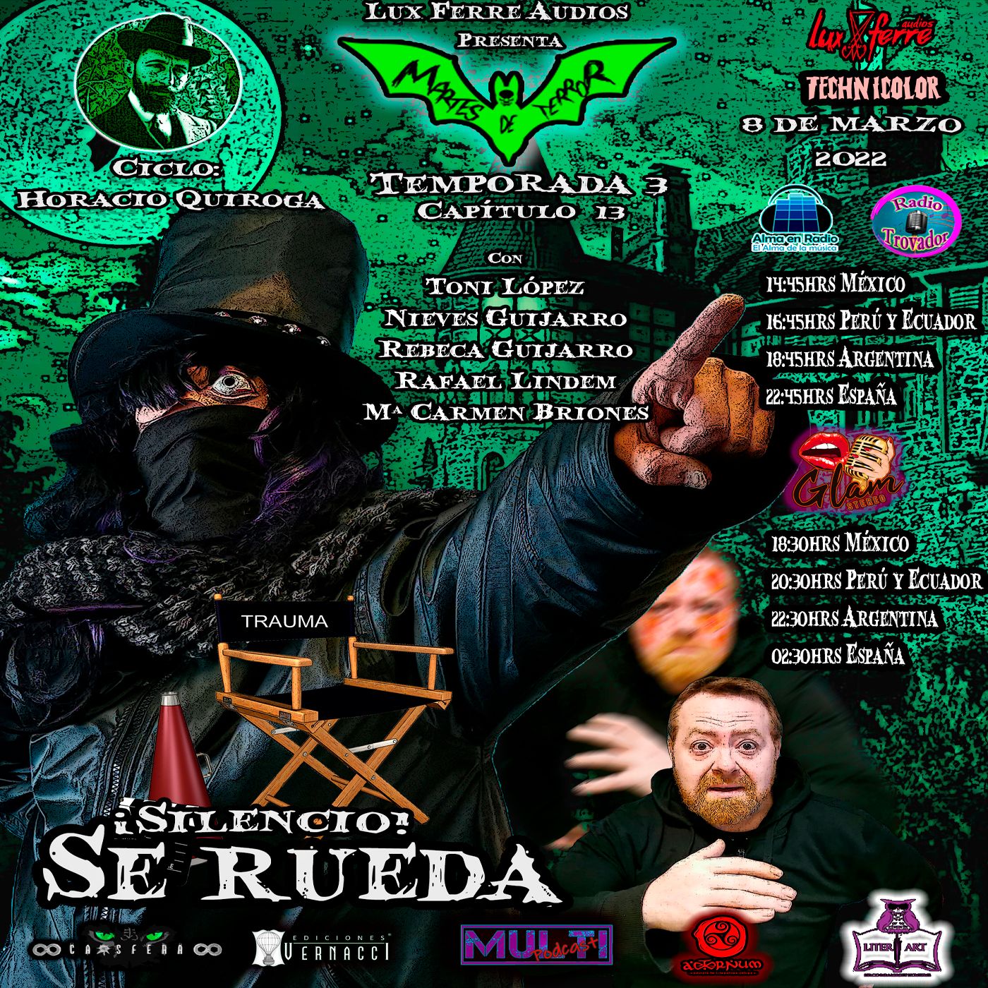 El terror tiene forma, en un cuento, un relato, un poema. Cada martes en Alma en Radio y en Radio Trovador, Lady Necrophage, Toni López, Evaristo «el epitafio», Don Notorio y el pequeño Trauma nos adentran en el terrorífico mundo del audio-relato.