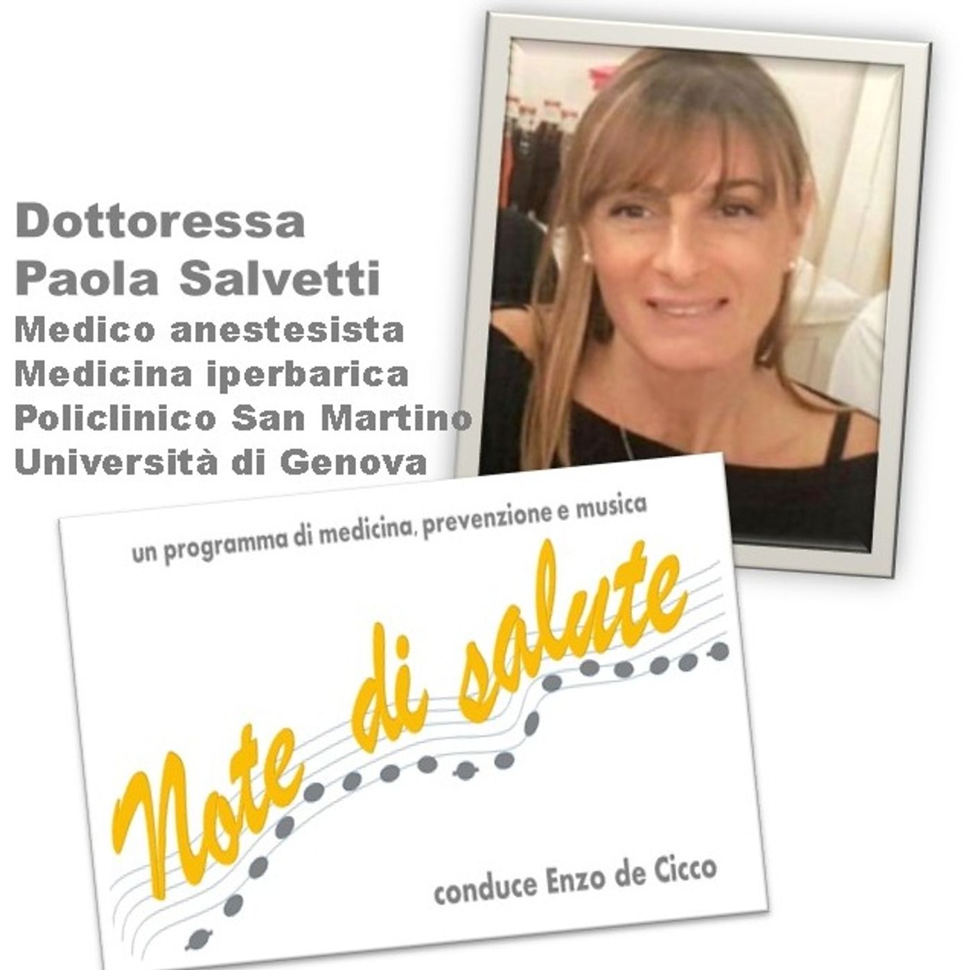 In questa puntata di Note di Salute, il programma di prevenzione, medicina e musica condotto dal dott. Enzo De Cicco, si parlerà di “camera iperbarica” insieme alla dottoressa Paola Salvetti, responsabile della struttura di medicina iperbarica del Policlinico San Martino di Genova, che ci spiegherà il funzionamento e l’utilizzo di questo importante strumento terapeutico.