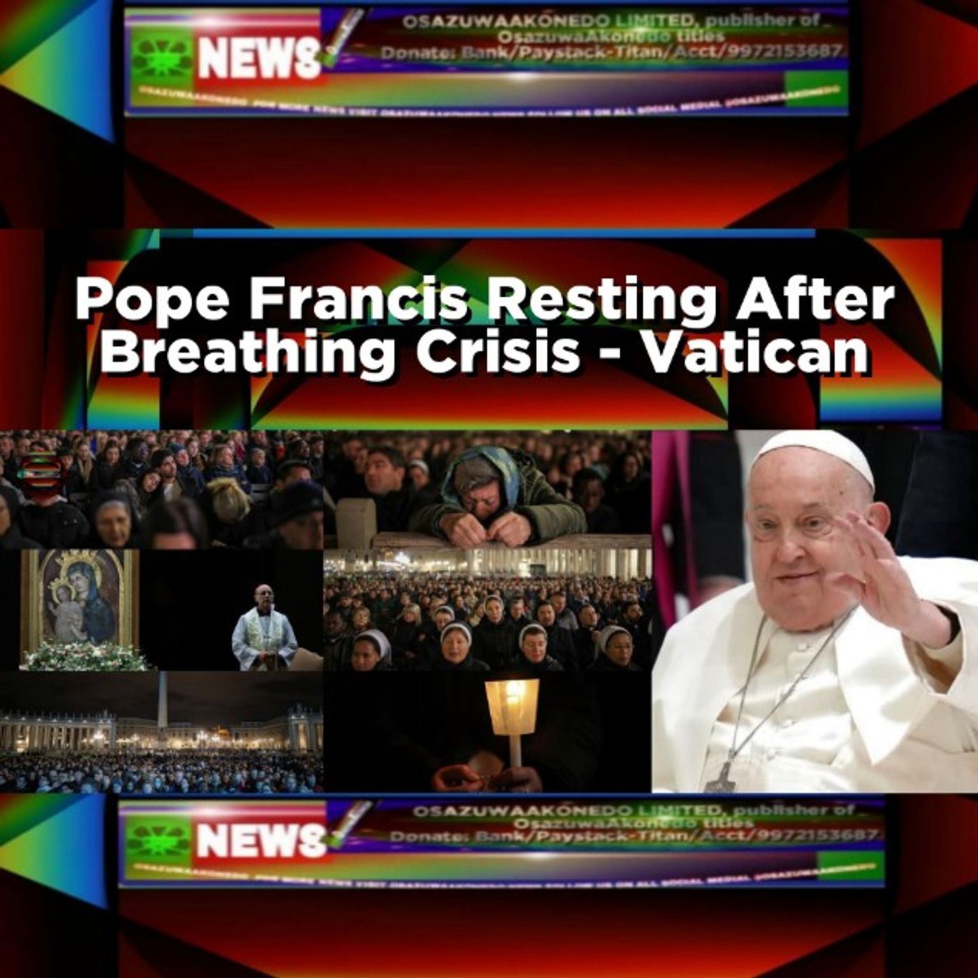 #Breaking News #Catholic #Francis #Pope ©March 2nd, 2025 ®March 2, 2025 4:42 am Vatican on Saturday says the head of the Catholic Church, Pope Francis slept well on Friday night and now resting after he had had a breathing crisis on Friday afternoon which led to him vomiting, making the 88 years old pontiff to be supported by a breathing machine.