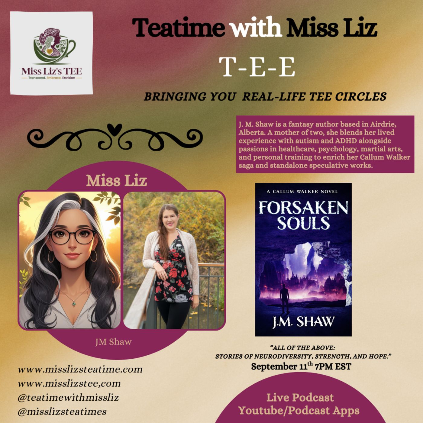 Teatime with Miss Liz Serves JM Shaw Strength in Neurodiversity September 11th, 7 pm EST. Topic: “All of the Above: Neurodiversity, Resilience, and the Stories We Tell.” Introduction: Join Miss Liz for a powerful and heartfelt Teatime with J.M. Shaw, a returning guest, author, and advocate for understanding, acceptance, and lifelong learning. Living in Airdrie, Alberta, with her husband and two young children, J.M. and her family embarked on a transformative journey after their shared diagnosis of autism and ADHD, embracing neurodiversity with compassion and courage. With a background in healthcare, psychology, martial arts, and personal training, J.M. brings a unique depth to her storytelling. Her book, Forshaken Souls, reflects her ability to blend personal insight, creative fiction, and powerful themes of identity, connection, and resilience.DescriptionJ.M. Shaw’s work shines a light on the strength found in vulnerability and the beauty of neurodiverse experiences. Forshaken Souls takes readers into a world where profound emotional truths are explored through fiction, challenging readers to understand themselves and others in new ways. In this Teatime, Miss Liz and J.M. will dive into conversations about neurodiversity, creativity, and the transformative power of sharing our stories — unapologetically and authentically. Closing Summary: This Teatime with J.M. Shaw will be an inspiring reminder of the strength that comes from embracing who we are. Through the lens of her book, Forshaken Souls, and her lived experiences, J.M. demonstrated that storytelling can be both a lifeline and a bridge — connecting us to ourselves and to each other in profound and healing ways. Tagline: “All of the Above: Stories of Neurodiversity, Strength, and Hope.”Suggested Hashtags#TeatimeWithMissLiz #JMShaw #ForshakenSouls #AllOfTheAbove #Neurodiversity #AutismAcceptance #ADHDAwareness #ResilientJourneys #CreativeHealing #StorytellingMatters #MissLizTEE #TranscendEmbraceEnvision
