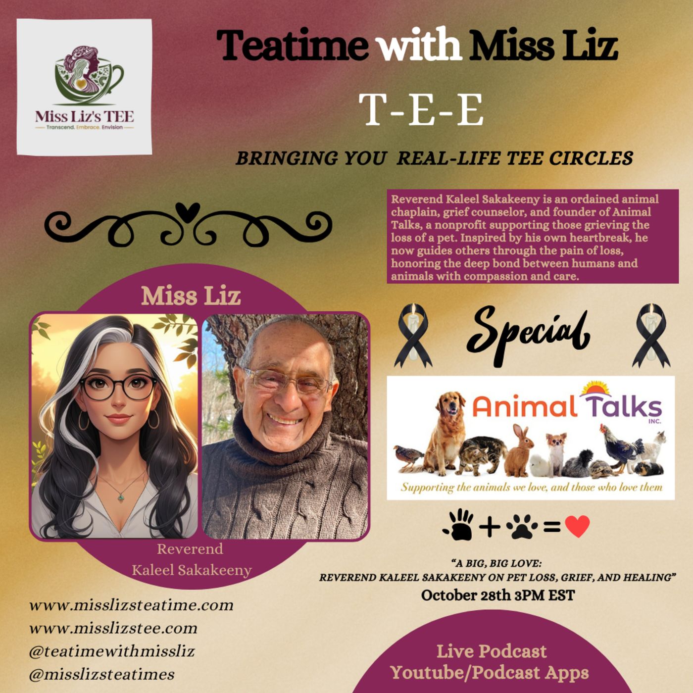 Teatime with Miss Liz, October 28th, 3 PM EST Serves Reverend Kaleel Sakakeeny: Pet Grief Animal Talks Topic