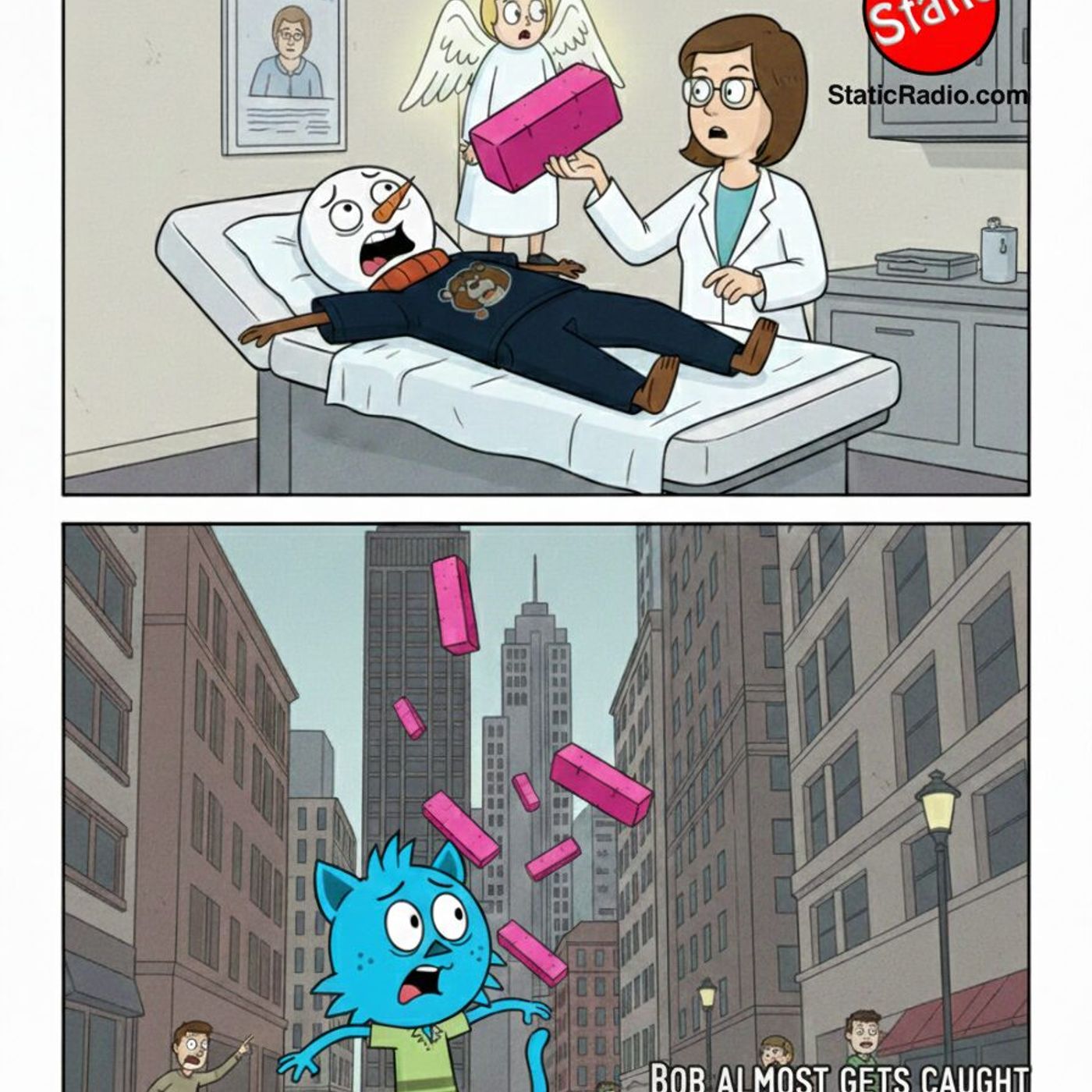 Miles throws out his back again and sees an angel, while Bob almost gets caught in the crossfire in downtown Chicago. _ultp_btn_ic_right_circle_line_ultp_btn_ic_end_Subscribe Random show from the last 25+ years Random Post https://youtube.com/live/CGdMK9_T6yk Bad AI Transcript of the show this week click a couple of things and uh bingo bango bongo and Irving we're on the internets foreign What are you… This is Dr. Death. It's more like choking on his own phlegm there for a second. I know. I know. More like, you know, gobs of snot. I know. I can't stop it, man. Yeah, hell no. I know. Can't help it. What's wrong with you? Jeez Louise. I don't know. You'd think you'd been sitting through a session with the Beatles. Christ. Mm-hmm. I tell you one story about the Beatles, which you refuse to look up. Paul is dead. Everybody knows that story. Everybody knows it. I told you one story, one story, and you got a little excited. It's one story only, sir. One story. You seem to relate to it, which is funny because you're like, oh, me and my friends, Kevin and Dave and Billy andjr and steven and squirrel skippy and uh that's right skippy and dougie yeah yeah i hear you exactly We'll have, maybe we'll talk about that on another time. Okay. All good. All good. All good, Bob. All good. All right. So I'm here with Da tonight. Da. Yeah. He's gone very, what do you want to call it? Existential or something. Yes. Something or another. Yeah. Whatever. Yeah. Making up words. Welcome, everybody, to the show. It's been a week. You haven't heard from us. You're wondering what's going on. You're like, how could this world be any better? Oh, wait. I'll listen to the show with Static Radio with Bob Miles. And it'll be better. So I went to Chicago this last week. Yeah. You were very cryptic. Yes. And so, yeah, I was in Chicago for a few days in downtown and I had, you know, it was a good time. Good time was had by all for the most part, you know, between the, between the traffic and, you know, the crush of humanity and,And the yelling and screaming. It was a good time. Did you go to Twin Anchors? No, I did not. Where's Twin Anchors at, anyway? It's like an old town up there by Lincoln Park. Oh, okay. No, I was in the loop. I was down… I was about a few blocks off Michigan Avenue. Mm-hmm. So… I don't think that's anywhere near Lincoln Park, is it? Probably not. Yeah. So why were you there? Why? Secret business. Okay. Can't talk about it. All right. You won't talk about it? Yeah, okay. All right. All right, asshole. Yeah, okay. Get it. All right. No, my wife had to be there for her work, and so I just tagged along and went. Yeah. oh i'm like oh i'll go sure why not i won't tell my boss. I'll just go yeah i i don't tell them anything. on other days why would i tell them about this right yeah why not yeah why what what is that whose concern is that of anyone's? Uh, my concern. Well, you're because you're a little and you're like, hey you're getting away with something. Yeah.I don't like people that work the system. I don't. You are a person that works the system. That is your MO. I know. You are a total system worker. I'm trying to push the button. You've got a T-shirt and everything. You've got a card-carrying member. Oh, free parking. Yeah, I'd take some free parking. What do I got to do? Yeah, I don't care. I give you whatever you want in the store. Take it for free. Don't matter to me. That's right. Don't be joking. As long as I get for me. Don't hate. Don't hate. So, no, we were down… And I happened to send you… There was a shooting downtown Chicago, and I was, like, not that far from it. Right. So… This was a big weekend in Chicago. They lit the Christmas tree down there by the Bean. What's it called over there? I don't know. It's Sunset Park. What is the name of that? Yeah, it's called Flickin' the Bean. Flickin' the Bean, yeah. It's Dave, you know. Oh, what the fuck is it? Yeah, there's Millennium Park. Millennium Park, that's it. Yeah, I know Chicago. You don't, yeah. I know. I don't go that often. You're much more versed in Chicago-ese or whatever. I want to learn.Yeah. And so I, um, so we were down a couple blocks off michigan avenue friday night they're gonna light the christmas tree. We actually went out to dinner, uh, right there nearby, right around the corner. And, um, and luckily i suppose we went back and by the time the shooting happened, I was asleep So I didn't hear anything. I didn't see anything. Even though eight people were shot. Yeah, eight people were shot. Like within a stone's throw of where I was sleeping. I was Sergeant Schultz. I knew nothing. I had actually seen this on the news prior to you announcing that you were close to the action. Yeah, no, it was weird. I had taken a picture, which I sent to you. Uh, it was right outside the Chicago theater. Uh, which I was, I was, I just, I'm like, Oh, this is neat picture. I'll take this picture. You know, like less than eight hours ahead of this whole event taking place. I mean, tons of people out on the street, tons of people. We had, we had dinner and then we headed back, you know, and we were probably back in our room, you know, by eight something, whatever it was. Sure. And then the shooting happened at 10 and I was already conked out. But, uh,Yeah, it's those weird happenstances in life because I think we literally walked past the area where everything transpired. We walked through that area just a couple hours ahead of it, right? Right. So, yeah, that was weird. So then I wake up on Saturday morning. My wife's like, hey, there was a shooting downstairs. Right. True, true, true. I'm like, what? I mean, that is the oddest feeling, right? It was. yeah i'm like really oh good i mean i so she had to work and i kind of just, you know bopped around for a couple days and so i walked through that area. I don't know how many times. Wow. You know, and even that, that day she had to go do stuff and i walked right down there. Everything wa