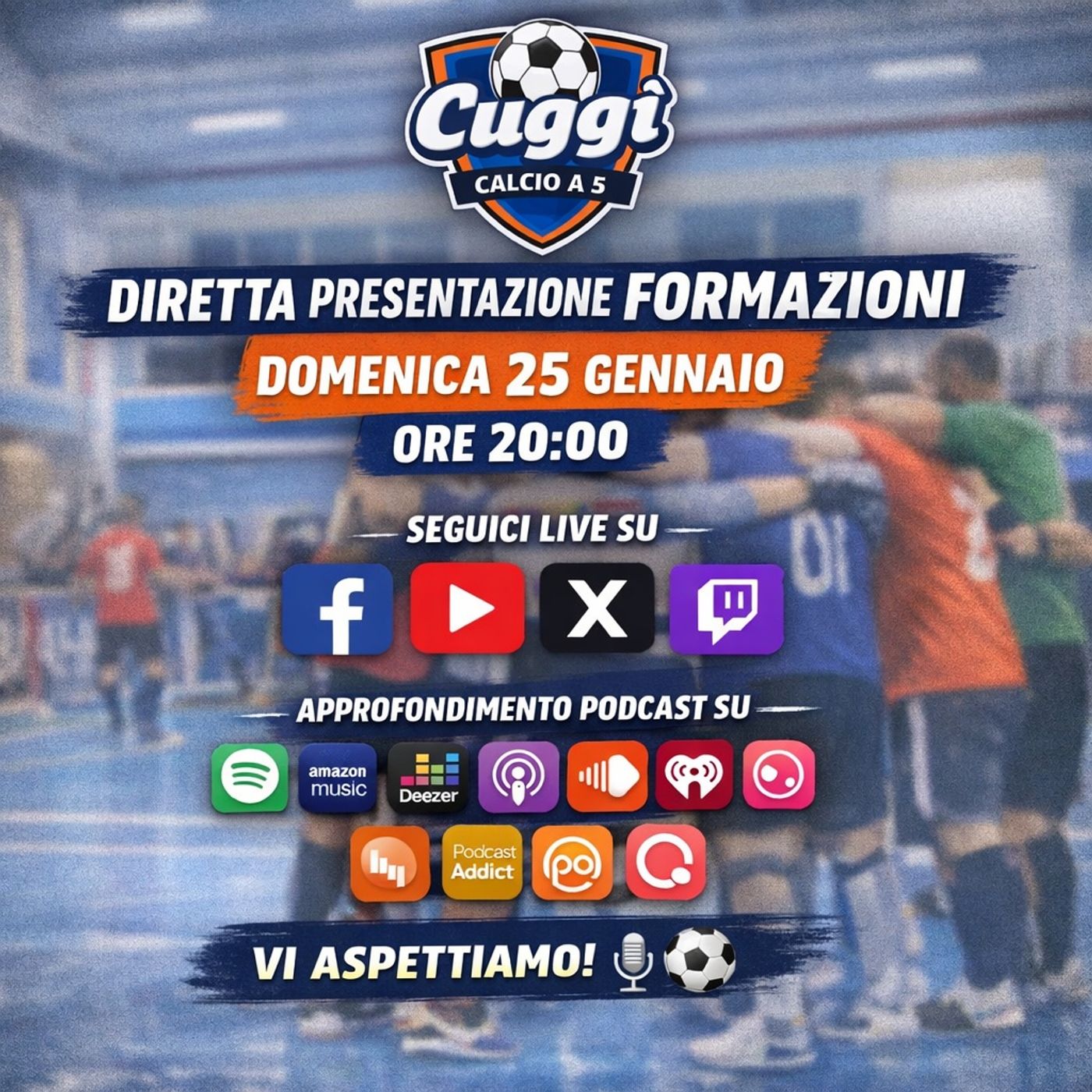 Il podcast annuncia una sfida di **calcio a 5** organizzata dal **Cuggì**, prevista per il 26 gennaio presso il palazzetto di **Forno Canavese**.