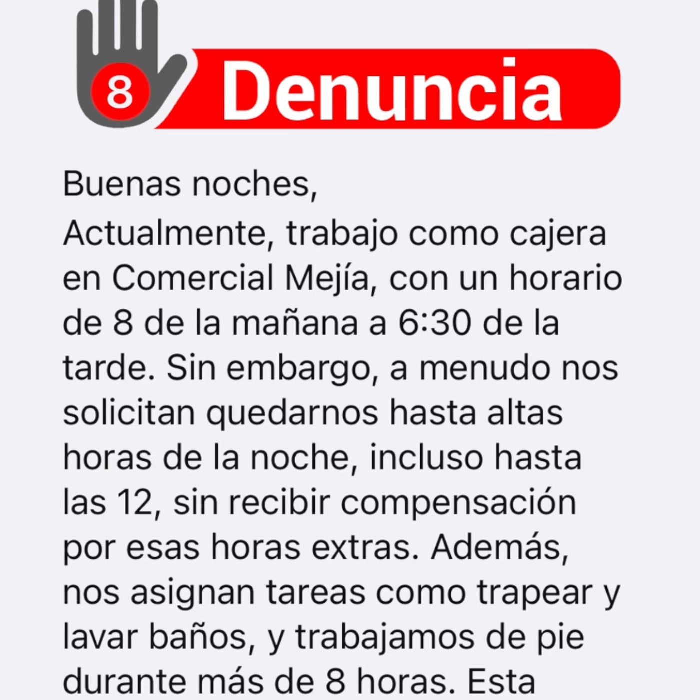 Buenas noches, Actualmente, trabajo como cajera en Comercial Mejía, con un horario de 8 de la mañana a 6:30 de la tarde. Sin embargo, a menudo nos solicitan quedarnos hasta altas horas de la noche, incluso hasta las 12, sin recibir compensación por esas horas extras. Además, nos asignan tareas como trapear y lavar baños, y trabajamos de pie durante más de 8 horas. Esta situación es desafiante y me gustaría que se considere una compensación adecuada por el tiempo adicional.