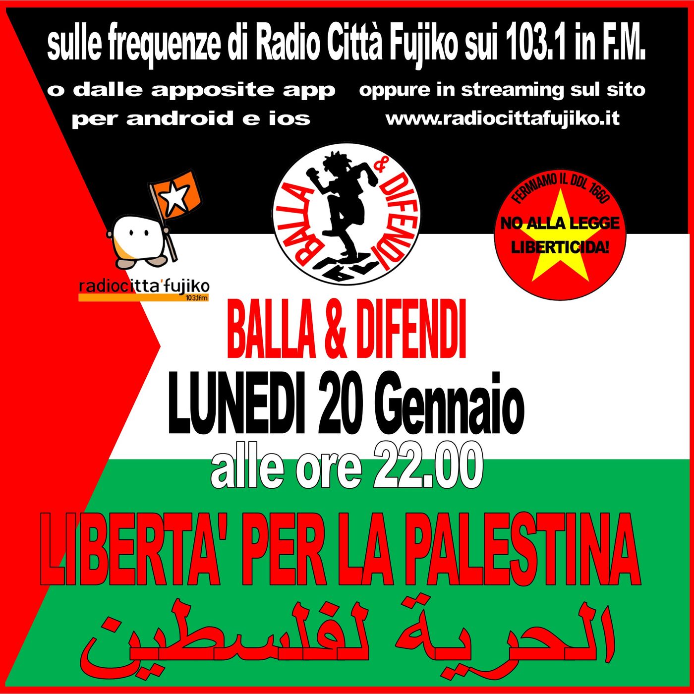 Puntata interamente dedicata alla Palestina e alla Resistenza del Popolo Palestinese ma non ignoriamo i fascismi di casa nostra che si materializzano con delle “passeggiate” intimidatorie e pubblicitarie nei luoghi dove ogni tanto nascono dei problemi che invece di essere affrontati con razionalità e lungimiranza vengono “aggrediti” con polizia ed esercito per rispondere nell’immediato ai mal di pancia della Società.