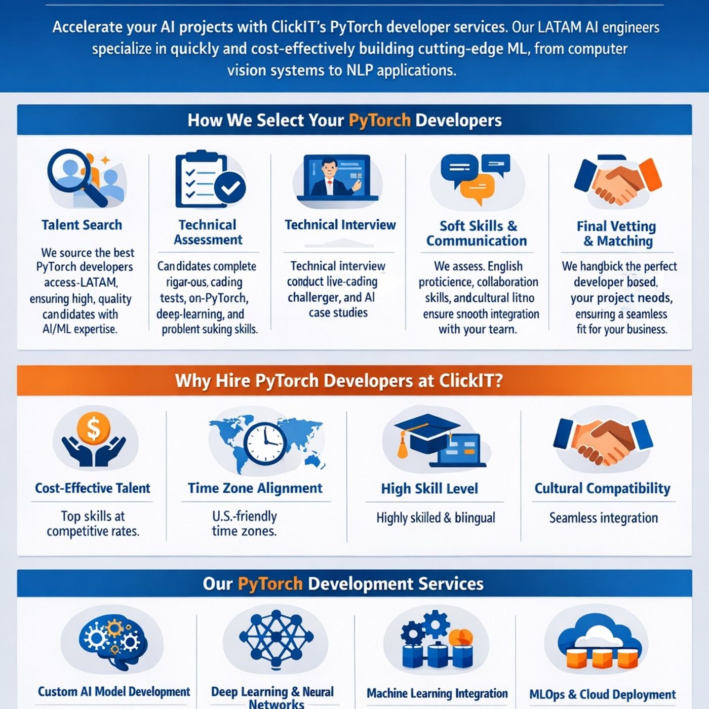 Hire PyTorch developers at ClickIT to create advanced AI systems aligned with your business objectives. The team manages the complete machine learning lifecycle, from model design to scalable deployment, delivering strong performance in computer vision, natural language processing, and predictive analytics solutions.