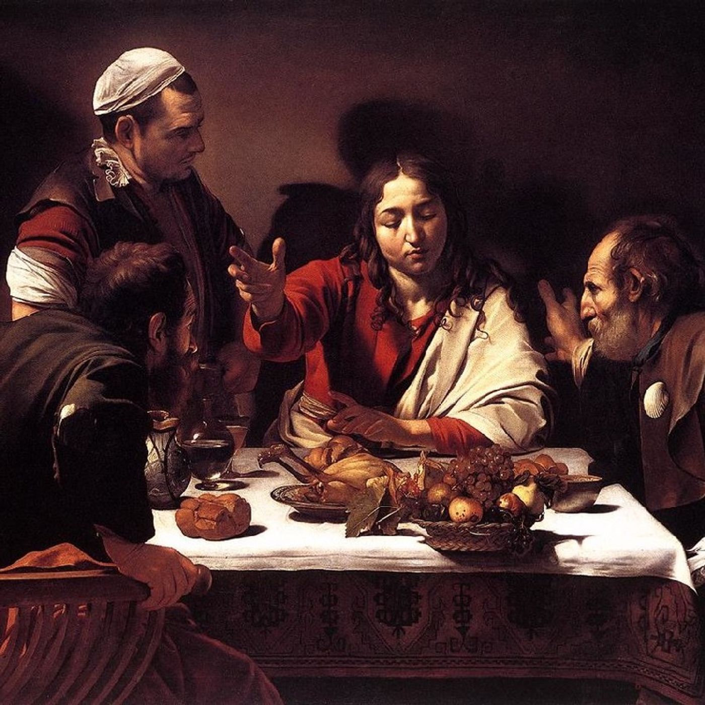 Aparición de Jesús a los discípulos de Emaús. Les celebra la primera Misa: Les amonesta con la Escritura y les parte el Pan. Les zarandea cariñosamente y les enciende el corazón.