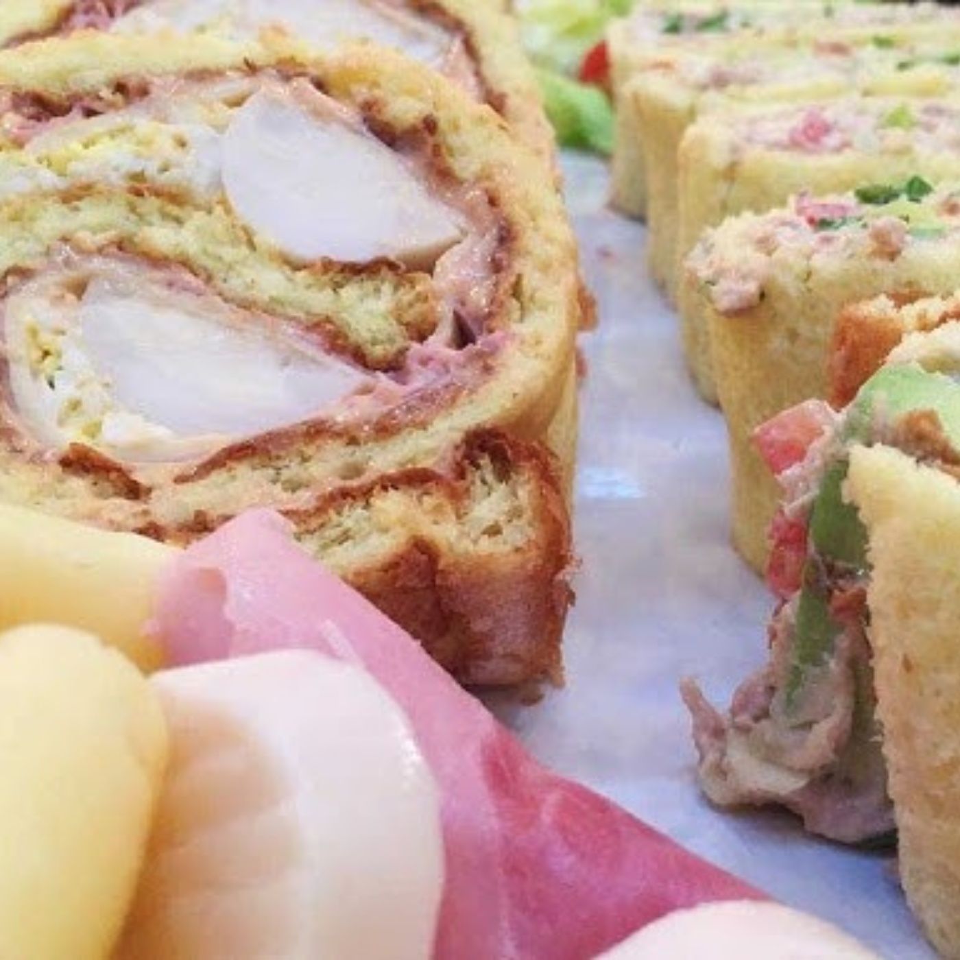 Para el de atún, untar el pionono con mayonesa y cubrir con atún, cebolla picada, tomate cubeteado, palta picada y hojas de lechuga.