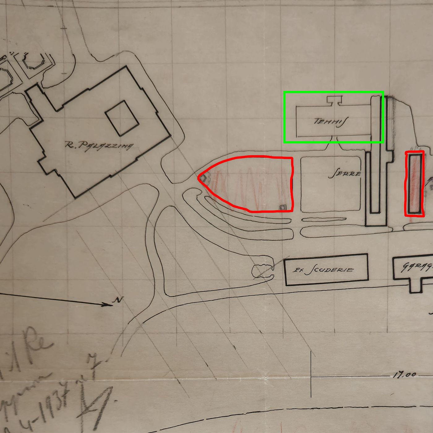 Presso l’Archivio Centrale dello Stato ho scovato un disegno, datato 3 aprile 1937, che evidenzia la presenza di un campo da tennis attiguo alla palazzina reale, campo quasi sicuramente realizzato da Vittorio Emanuele III, per i momenti di svago.
