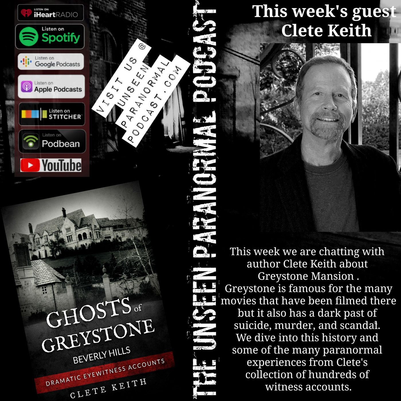 This week we chat with "Ghost of Greystone: Beverly Hills" author, Clete Keith, about this famous movie landmark and its sordid and haunted past. We discuss if the murders, suicides, and scandals that happened within the mansion walls could be responsible for the incredible number of paranormal experiences or if the land itself is cursed. Clete worked in an office on the grounds of Greystone for over 2 decades and decided to write about the Doheny estate after experiencing paranormal activity and hearing stories from guest. The book includes the history of the Doheny family paired with photos and 237 ghost stories from 86 eyewitnesses that he collected over 3 years. You may recognize Greystone Mansion from movies such as Spiderman, The Big Lebowski, Batman and Robin, X-Men, and many more. https://www.ghostsofgreystone.com/ https://www.amazon.com/Ghosts-Greystone-Beverly-Clete-Keith/dp/1733155910/ref=tmm_pap_swatch_0?_encoding=UTF8&qid=1638224616&sr=8-1