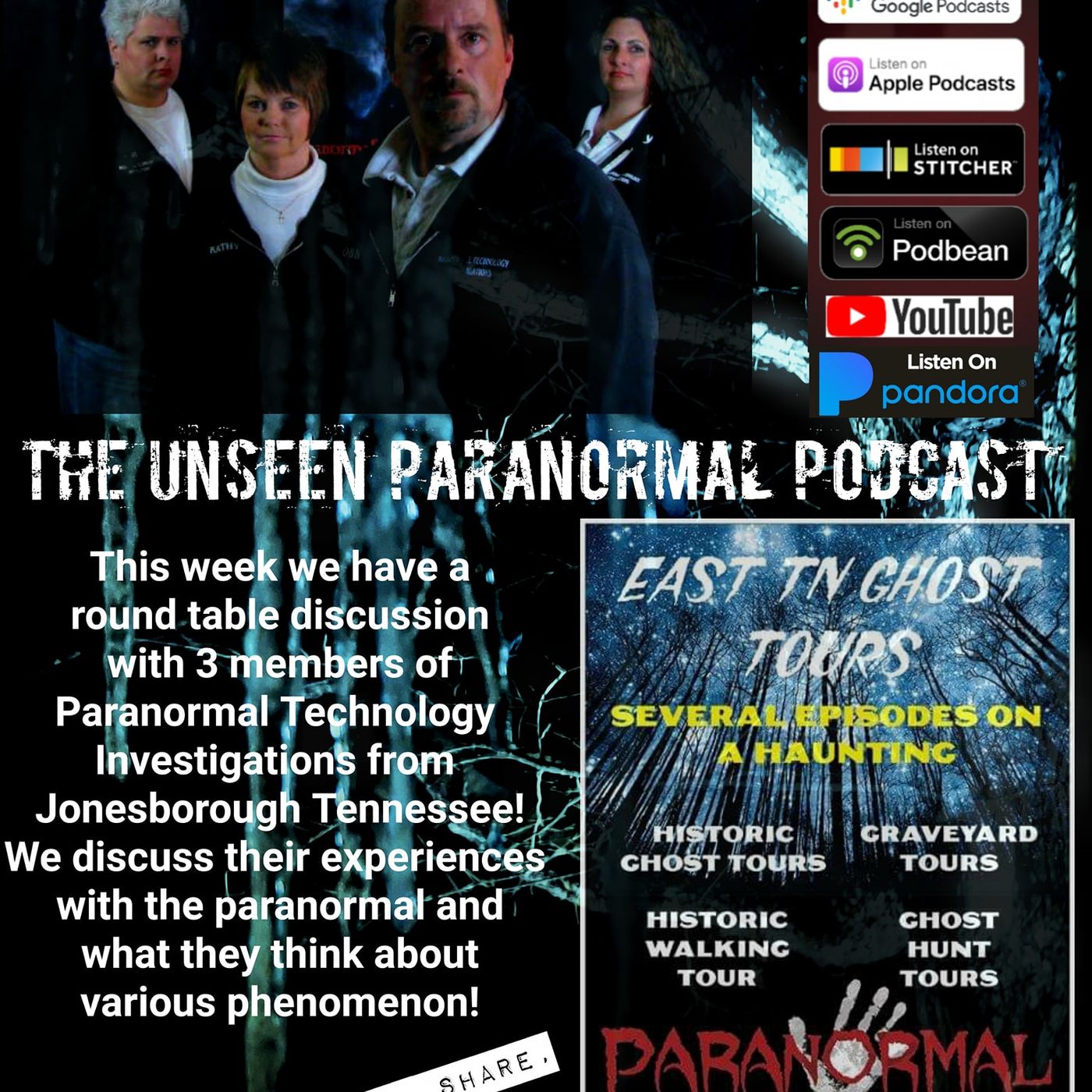 On this episode we are chatting with 3 team members of Paranormal Technology Investigations and East Tennessee Ghost Tours from Jonesborough Tennessee. PTI have been featured on several episodes of the TV show "A Haunting" and "Monsters and Mysteries in America". We have a round table discussion about their experiences and their approach to investigating. https://www.facebook.com/ParanormalTechnology https://www.facebook.com/paranormaltechnologyinvestigations
