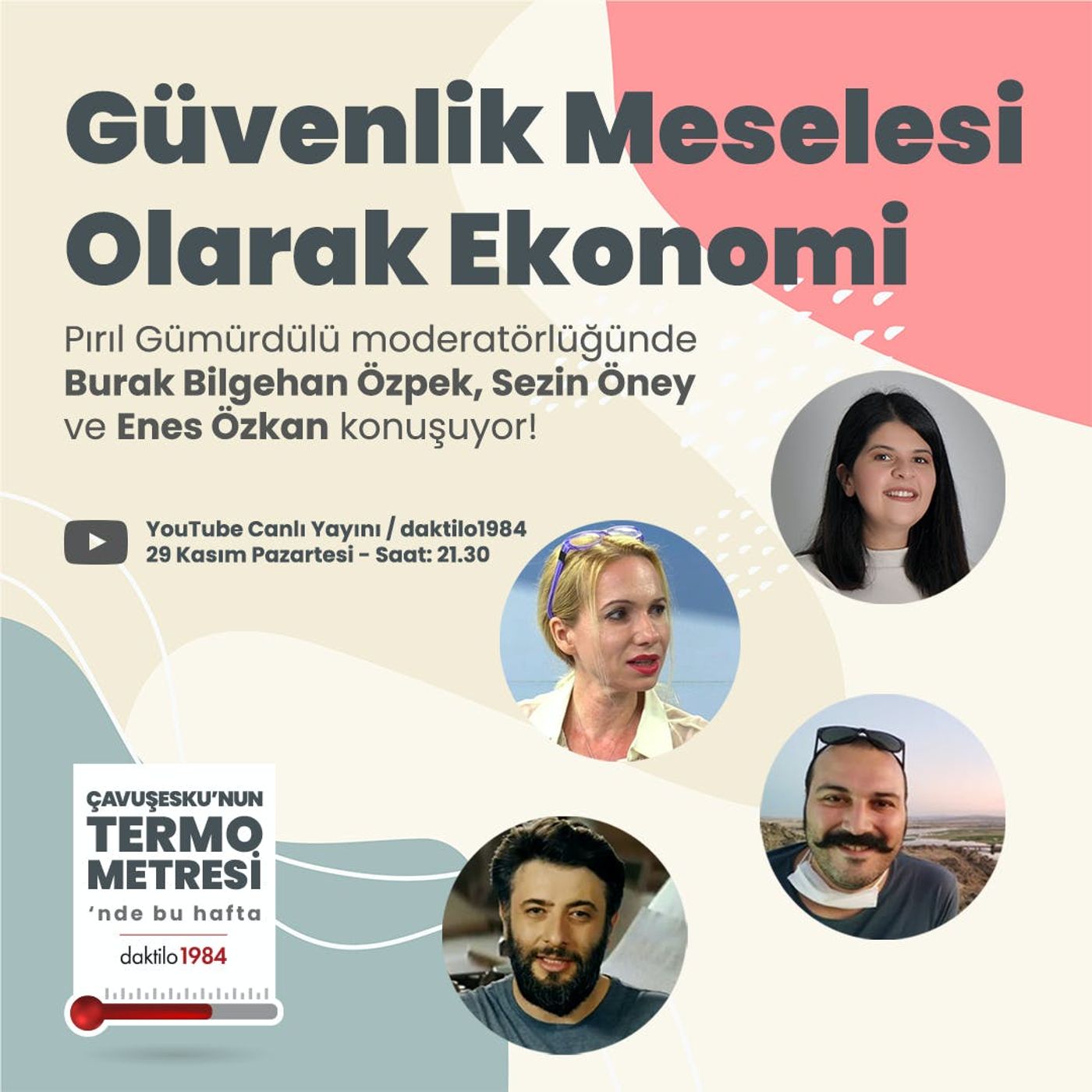 Çavuşesku'nun Termometresi'nde bu hafta, Pırıl Gümürdülü'nün moderatörlüğünde Sezin Öney, Bilgehan Özpek ve Enes Özkan güvenlik meselesine dönüştürülen ekonomik kriz üzerine konuşuyor.