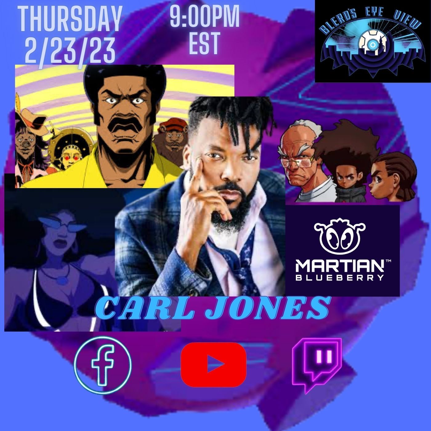 We have a legend in the building!! Carl Jones @iamcarljones @wearemartianb is best known for his work as co-executive producer of THE BOONDOCKS, the first Cartoon Network program to win a Peabody Award and be nominated for a NAACP Image Award and executive producer and head writer of Adult Swim’s BLACK DYNAMITE. He recently served as an executive producer on the animated reboot of Good Times for Netflix from Fuzzy Door and Norman Lear’s ACT III and HBO Max’s Young Love based on the Oscar-winning animated short, Hair Love. Carl co-created Adult Swim’s FREAKNIK THE MUSICAL and produced and wrote on two seasons of Comedy Central’s LEGENDS OF CHAMBERLAIN HEIGHTS. Carl also wrote for Adult Swim’s THE JELLIES! starring Tyler The Creator and served as showrunner. You don’t want to miss this!! #blerdseyeview #blerdseyeviewpodcast #blerdandpowerful #blerdandboujee #theboondocks #blackdynamite #animation #adultswim #livestreaming #fortheculture #blerd #youtuber #facebook #twitch #fyp