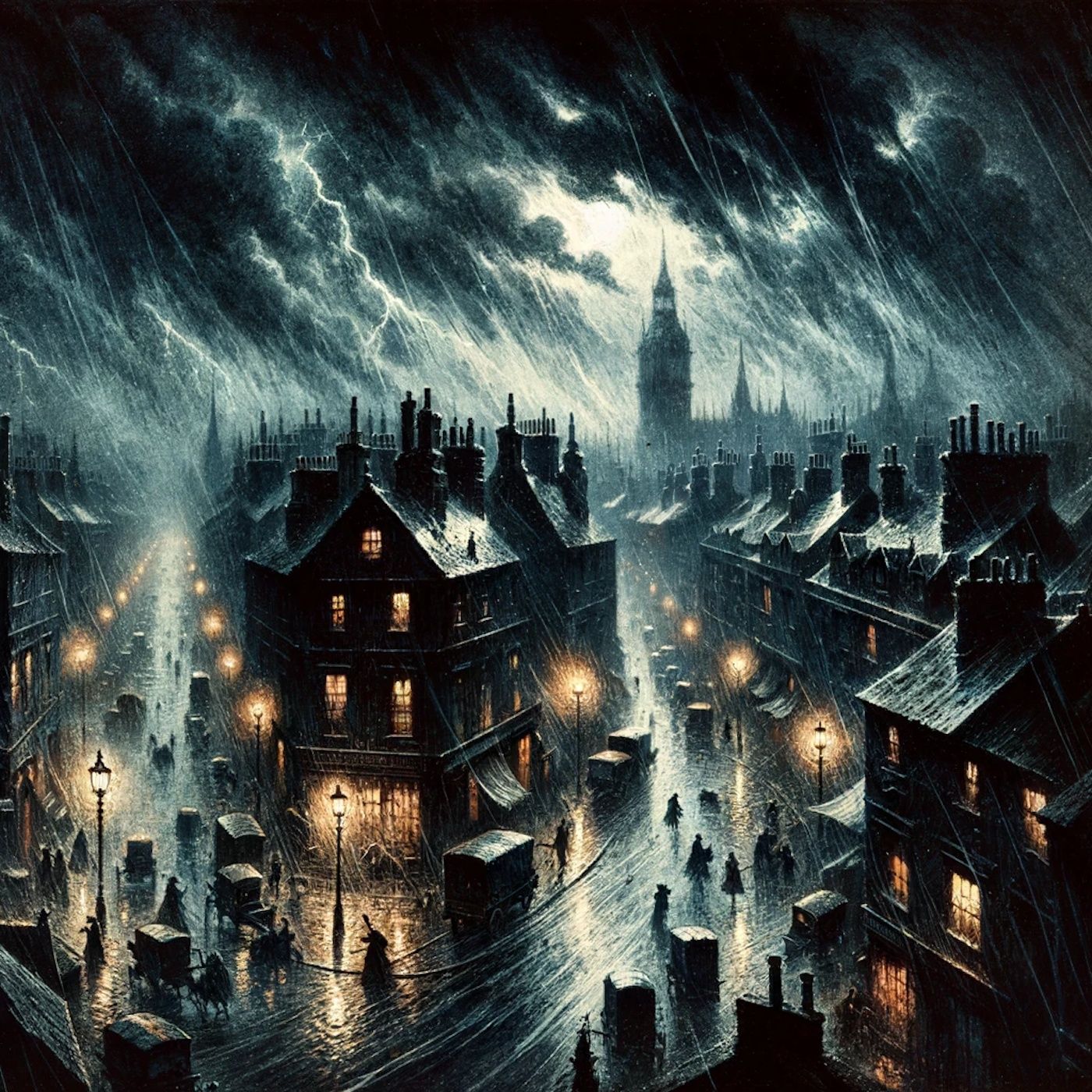 „It was a dark and stormy night; the rain fell in torrents, except at occasional intervals, when it was checked by a violent gust of wind which swept up the streets (for it is in London that our scene lies), rattling along the housetops, and fiercely agitating the scanty flame of the lamps that struggled against the darkness."