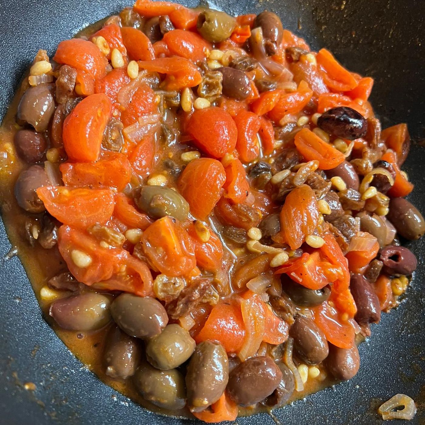 Aggiungete: le olive taggiasche, l’uvetta, i pinoli e i calamari.