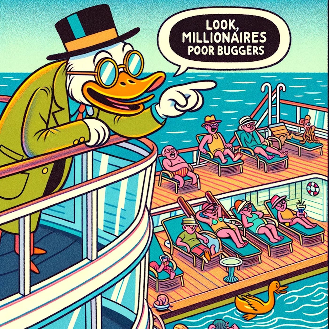 Scrooge McDuck to Donald Duck on a cruise ship, pointing to the sun deck below them.