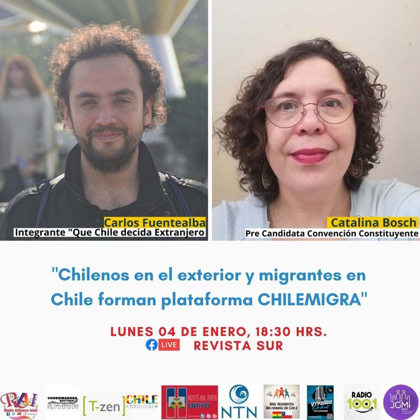 Carlos Fuentealba, integrante de "Que Chile decida Extranjero", y Catalina Bosch Carcuro, candidata independiente a la asamblea constituyente y miembro de la Coordinadora Nacional de Inmigrantes Chile, cuentan todo sobre la construcción de la plataforma ChileMigra. En la música Miguel Ángel Caballero y su canción "De Norte a Sur"