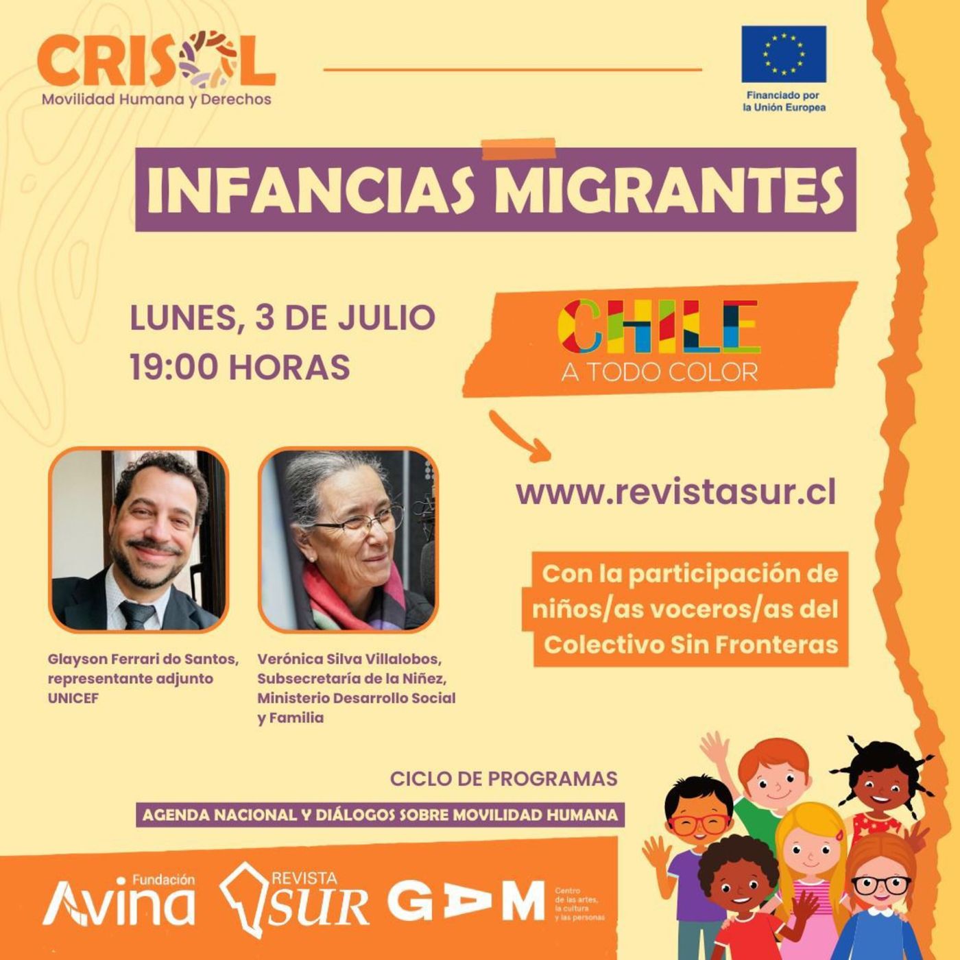Cómo se garantiza el acceso de derechos de niños, niñas y adolescentes, y sus realidades cuando migran a Chile, son algunos de los temas que se abordamos en este nuevo episodio de Chile a Todo Color. Conversamos con un panel invitado, compuesto por Verónica Silva Villalobos, subsecretaría de la Niñez, en el Ministerio Desarrollo Social y Familia, Glayson Ferrari do Santos, representante Adjunto UNICEF, y la participación de niños/as voceros/as del Colectivo Sin Fronteras, bajo la conducción del periodista y director del programa, Jorge Rizik.
