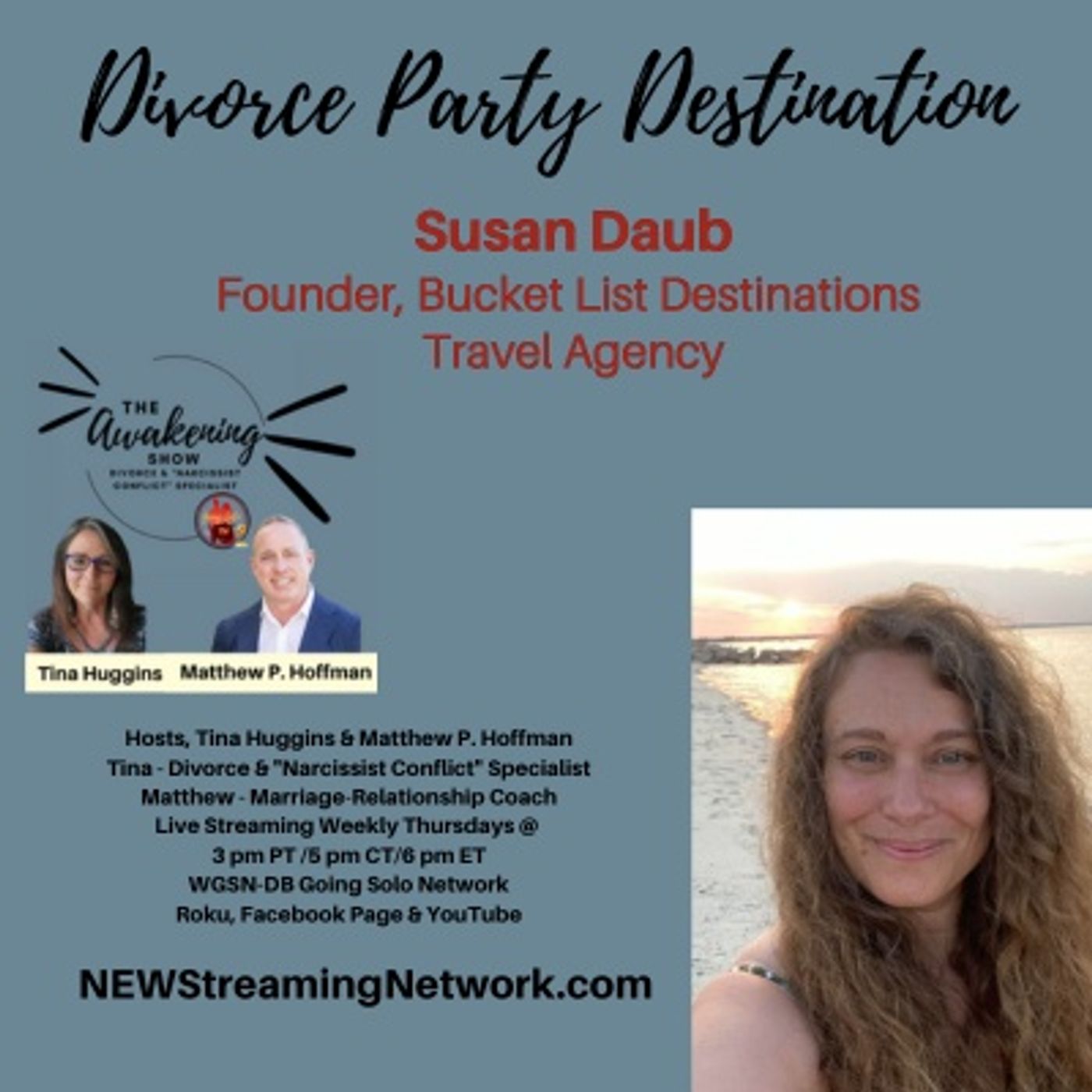 Tune in to NEWStreamingNetwork.com for an inspiring conversation on embracing fresh starts and crafting unforgettable journeys after divorce., Founder of Bucket List Destinations Travel Agency. In this episode titled "Divorce Party Destination," they explore the emerging trend of celebrating new beginnings post-divorce through specialized travel experiences. Susan shares insights into planning memorable divorce party getaways, discussing popular destinations and personalized travel packages designed to mark this significant life transition.