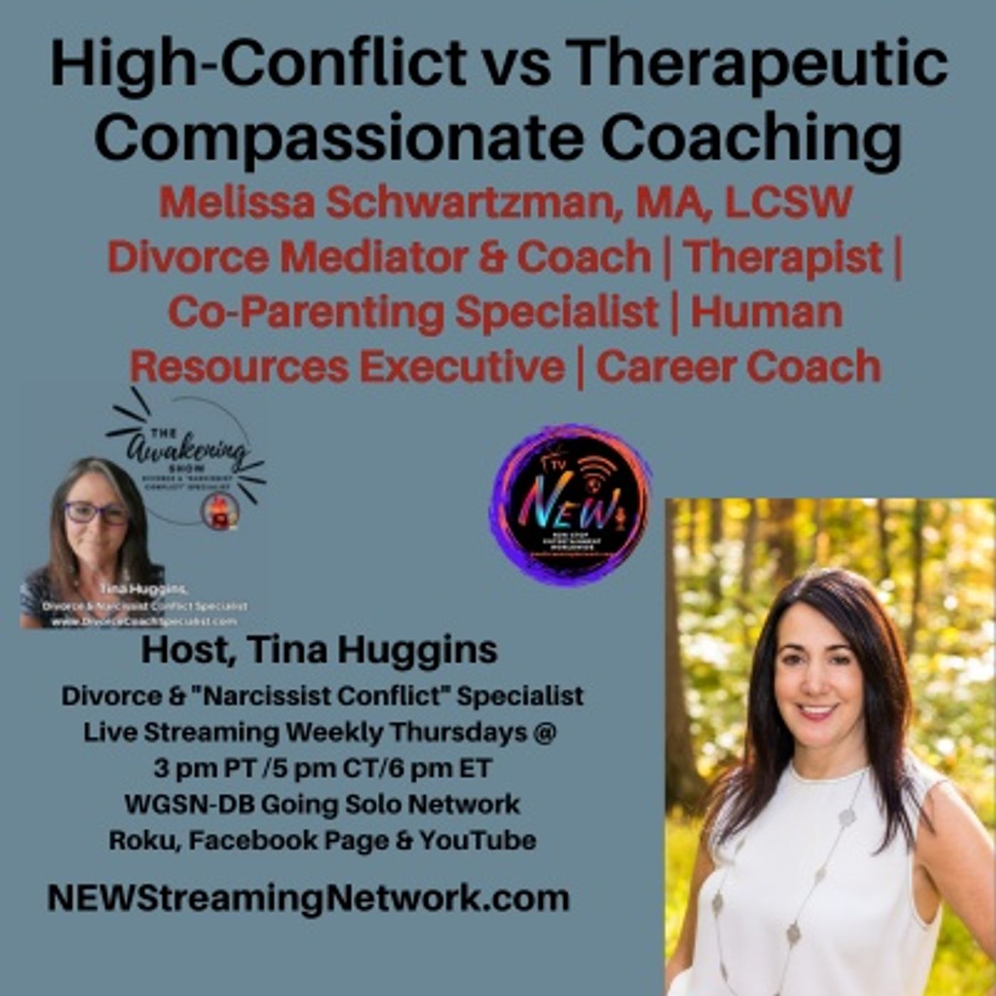 💔 High-Conflict vs Therapeutic Compassionate Coaching 💔 On this episode of The Awakening on NEWStreamingNetwork.com, host Tina Huggins, Divorce & “Narcissist Conflict” Specialist, welcomes Melissa Schwartzman, MA, LCSW — Divorce Mediator, Coach, Therapist, Co-Parenting Specialist, Human Resources Executive, and Career Coach. Together, they dive into the differences between high-conflict coaching approaches and therapeutic, compassionate strategies that help families navigate divorce with clarity, healing, and hope.