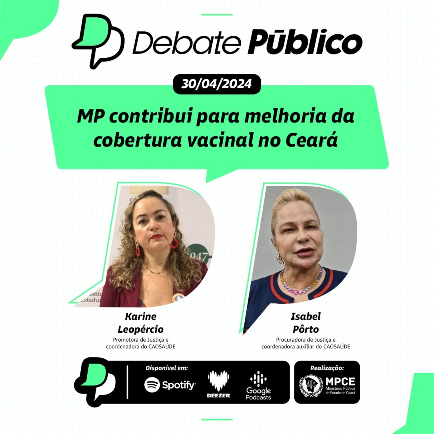 O tema desta semana do Debate Público é o MP contribui para melhoria da cobertura vacinal no Ceará. As entrevistadas são: a promotora de Justiça e coordenadora do CAOSAÚDE. Karine Leopércio; e a procuradora de Justiça e coordenadora auxiliar do CAOSAÚDE, Isabel Pôrto.