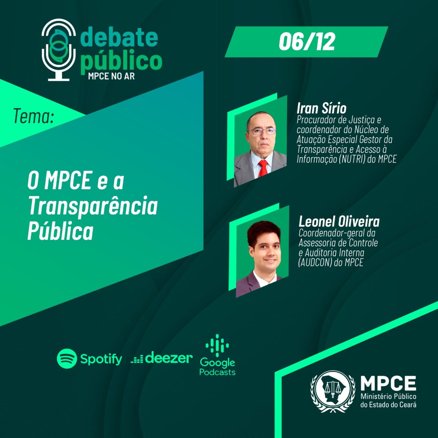 O Debate Público desta terça (06/12) trata sobre o MPCE e a Transparência Pública. O procurador de Justiça e coordenador do Núcleo de Atuação Especial Gestor da Transparência e Acesso à Informação (NUTRI) do MPCE, Iran Sírio, e o coordenador-geral da Assessoria de Controle e Auditoria Interna (AUDCON) do MPCE, Leonel Oliveira, são os entrevistados.